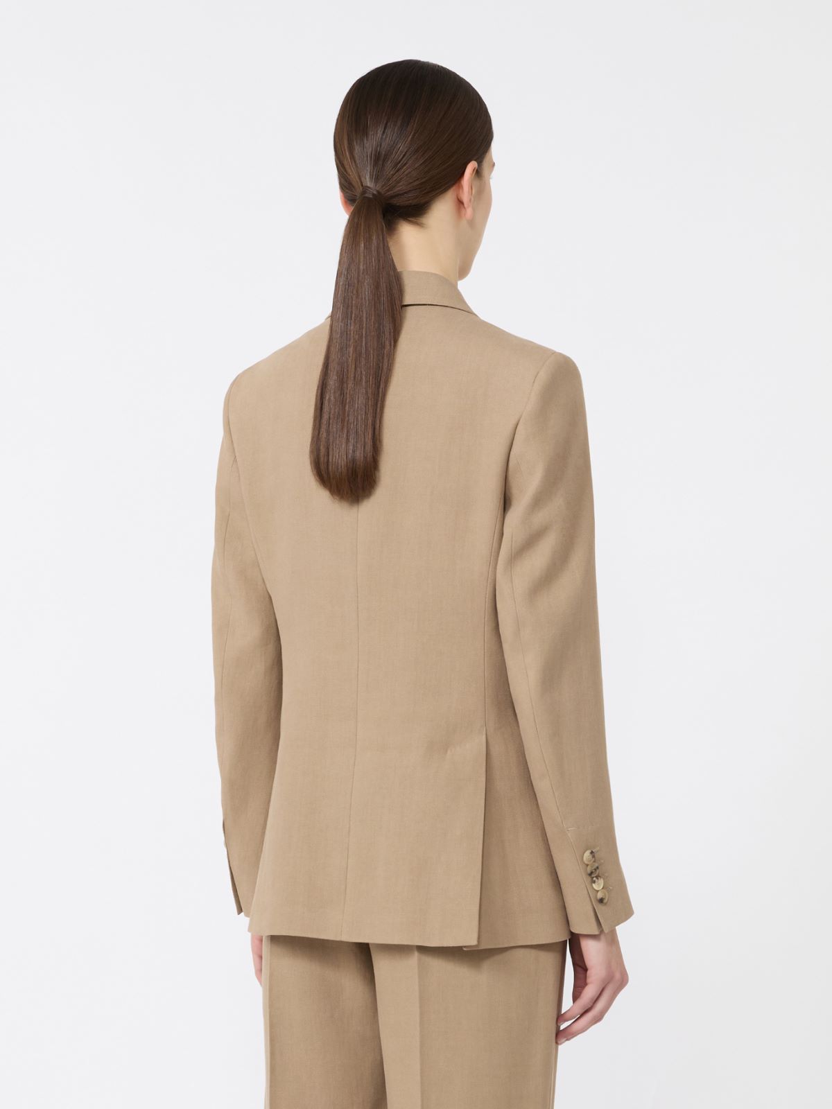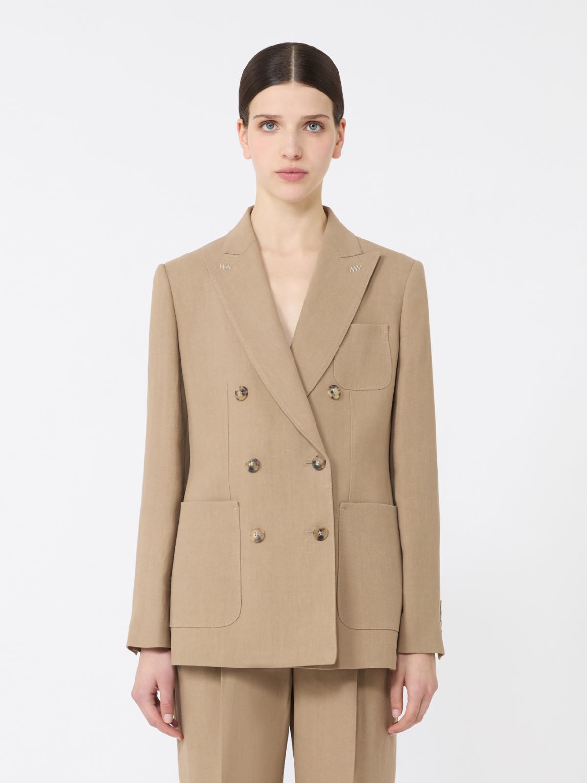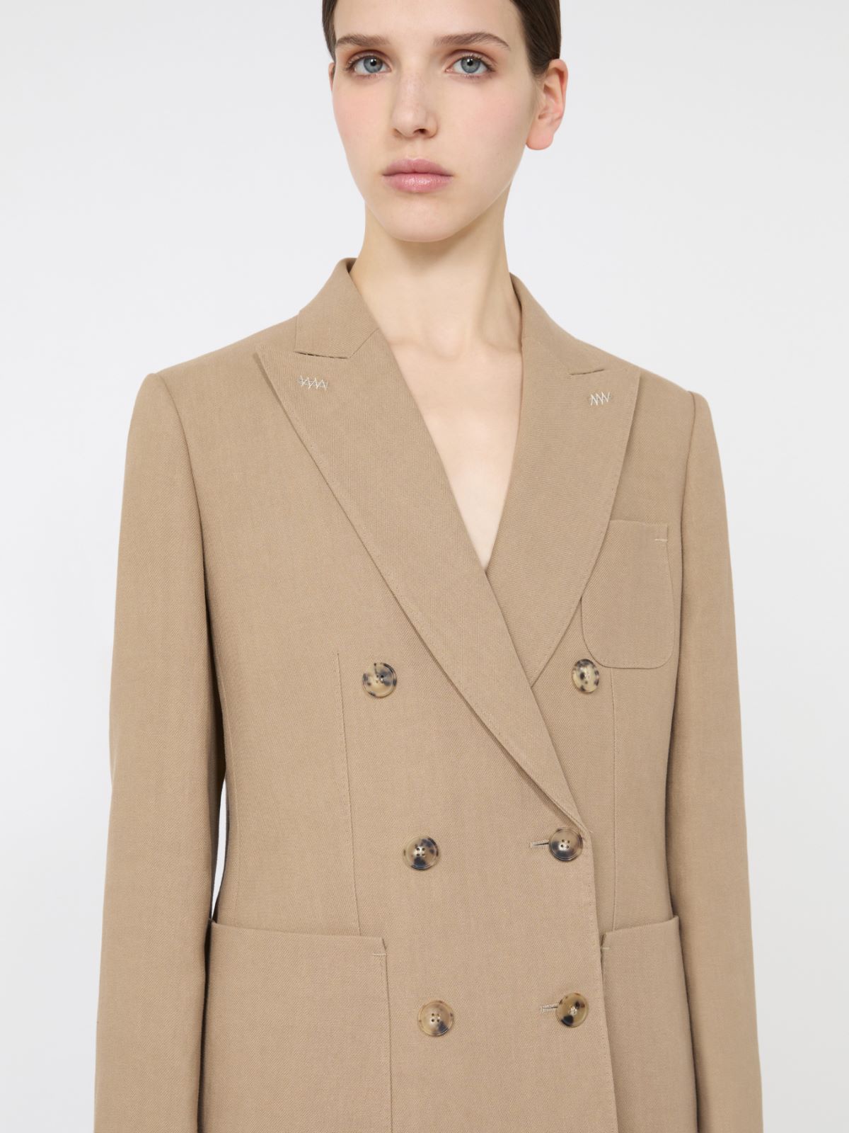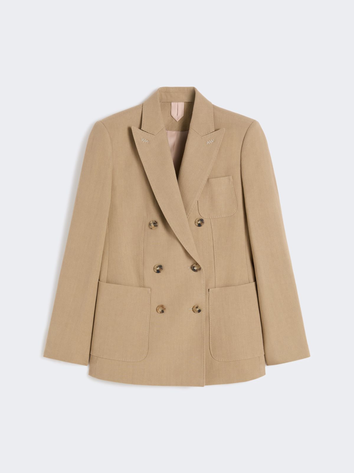 유연하게 흐르는 실루엣과 탄탄한 텍스처가 특징인 더블 브레스트 블레이저입니다.