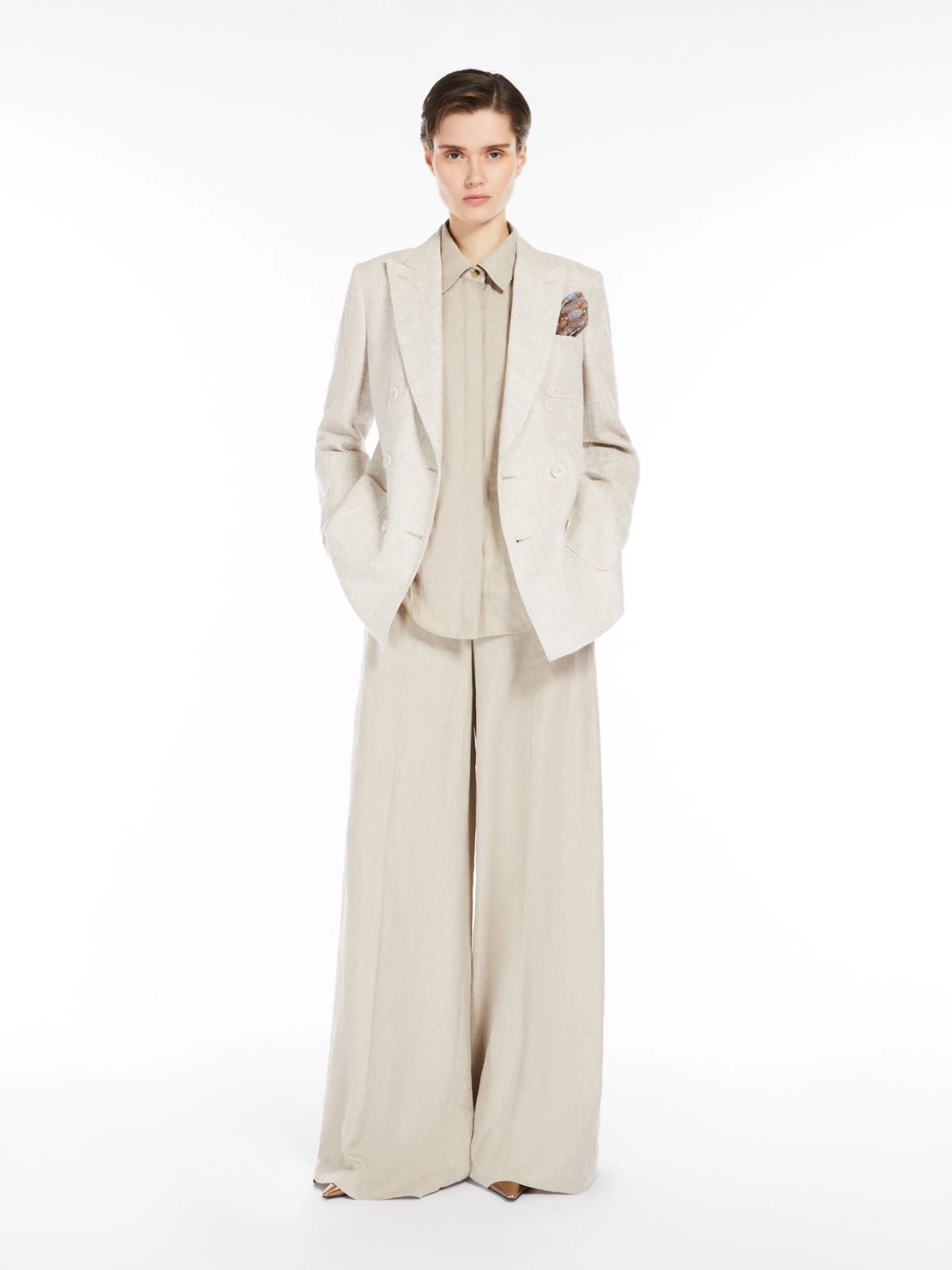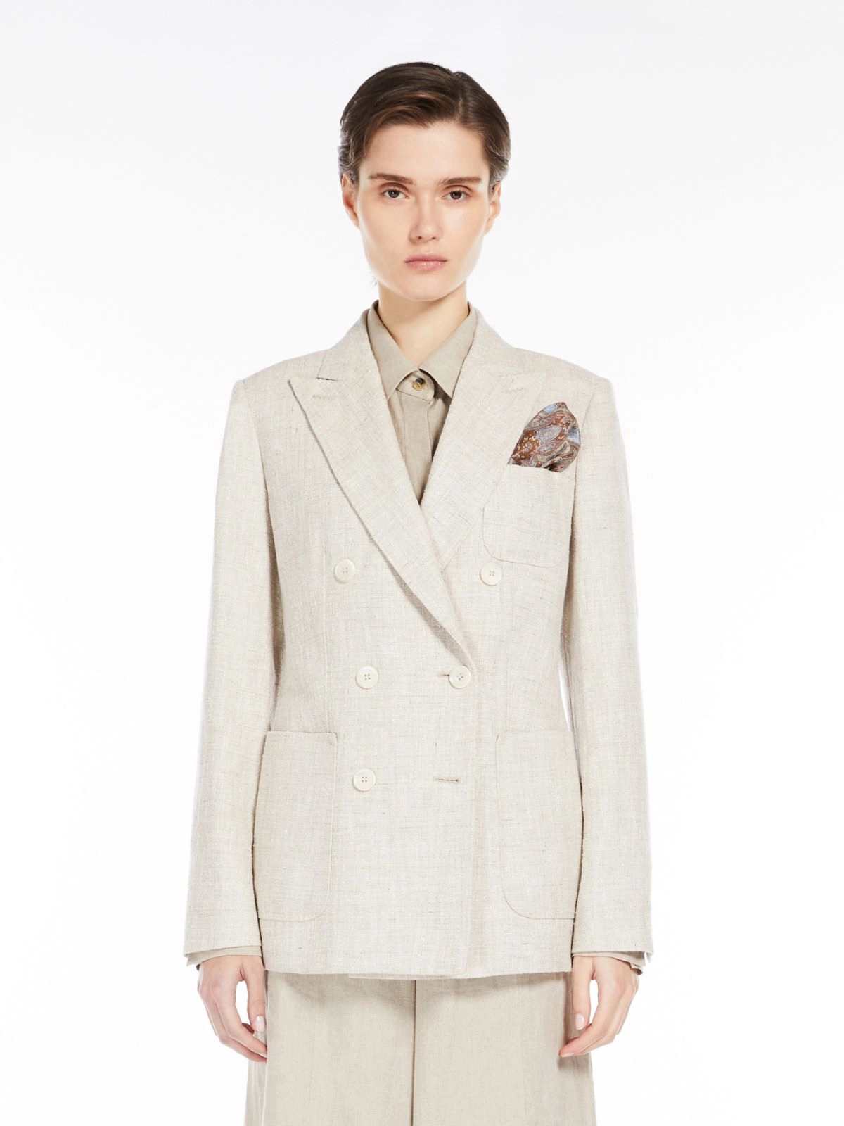울, 린넨, 실크 혼방 소재의 더블 브레스티드 블레이저로 섬세하고 가벼운 텍스처가 특징입니다. 프리제 패턴은 자연스러운 색조로 원단에 소박한 느낌을 주고, 손에 닿았을 때 기분좋은 느낌을 제공하며 뛰어난 성능을 보장합니다. 캔버스로 처리된 구조로 피크 라펠, 앞면에 패치 포켓 세 개가 있으며, 몸에 붙는 실루엣은 픽 스티치 밑단과 뒷면의 측면 트임이 있습니다. 대조를 이루는 아이보리 색상 큐프로 원단으로 부분 안감 처리되어 있습니다. 마더오브펄 소재 단추를 사용한 잠금 방식입니다.