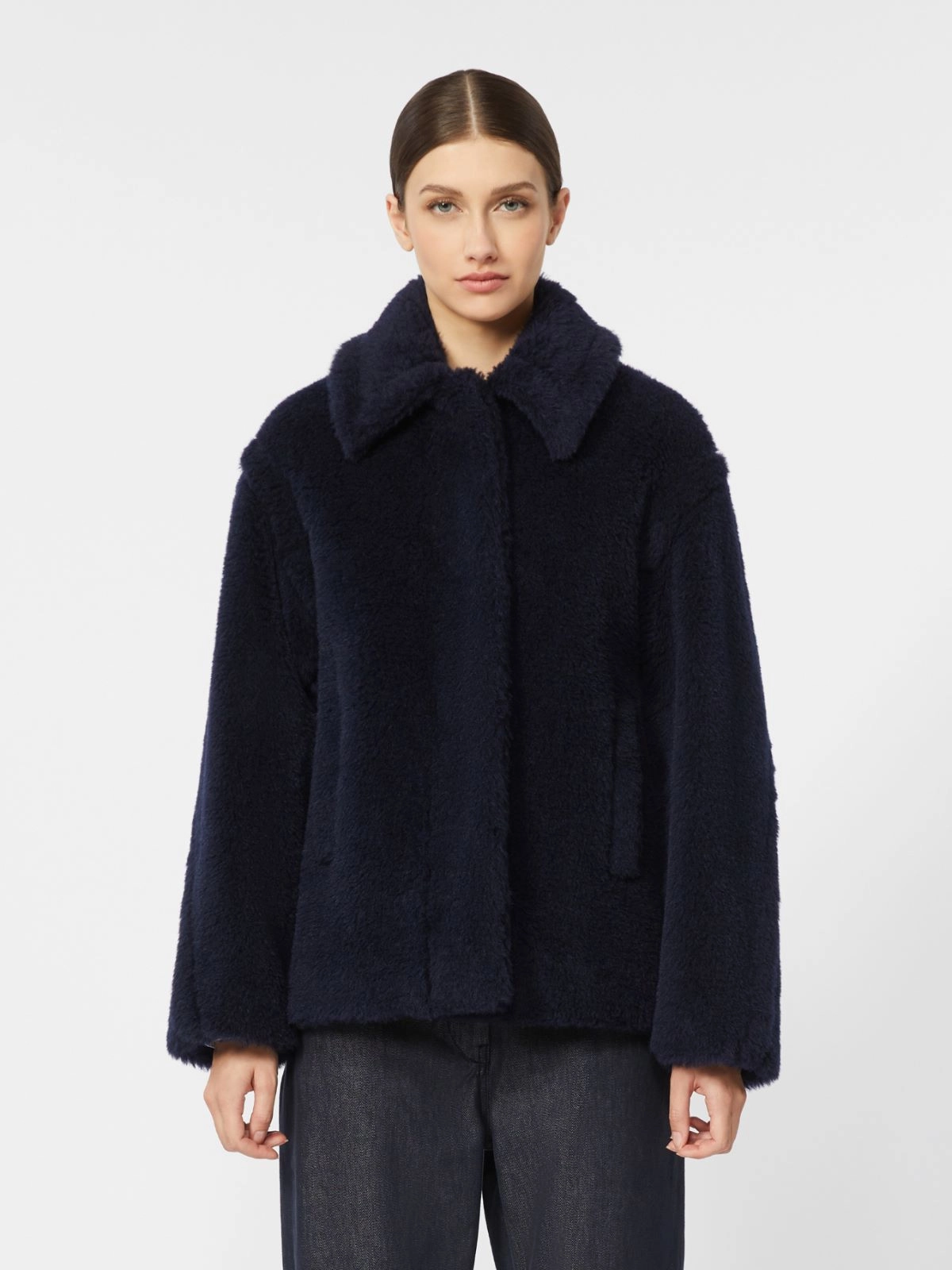 테디 베어에서 영감을 얻은 크롭 기장 코트입니다.