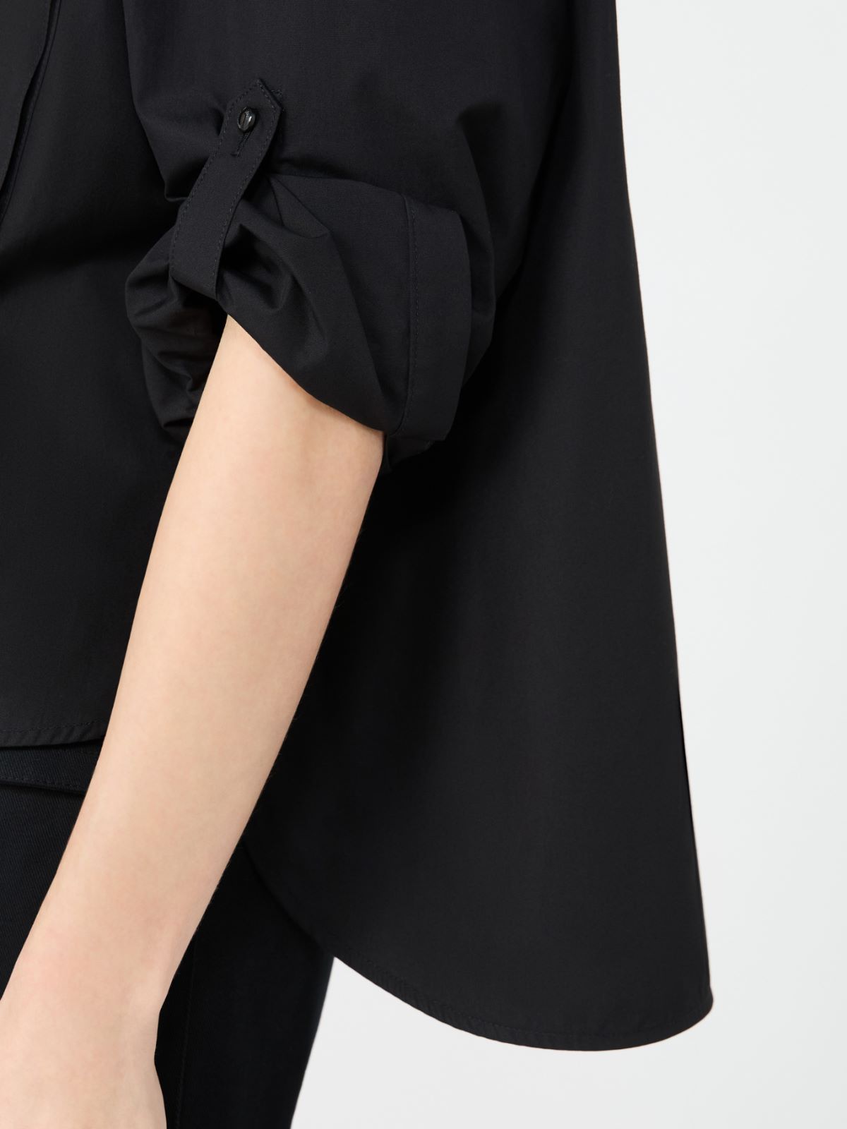 - 셔츠 카라와 스트랩으로 고정한 접어 올린 소매
