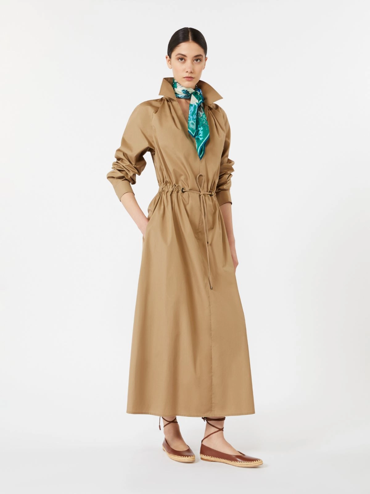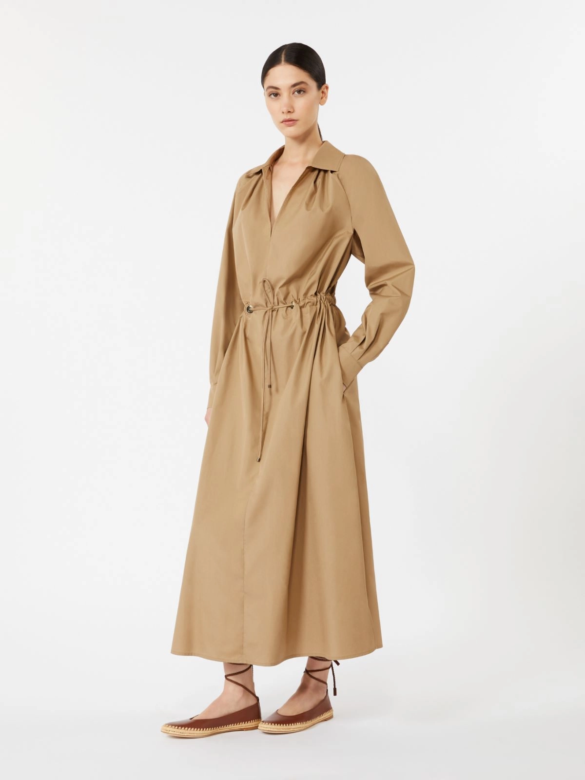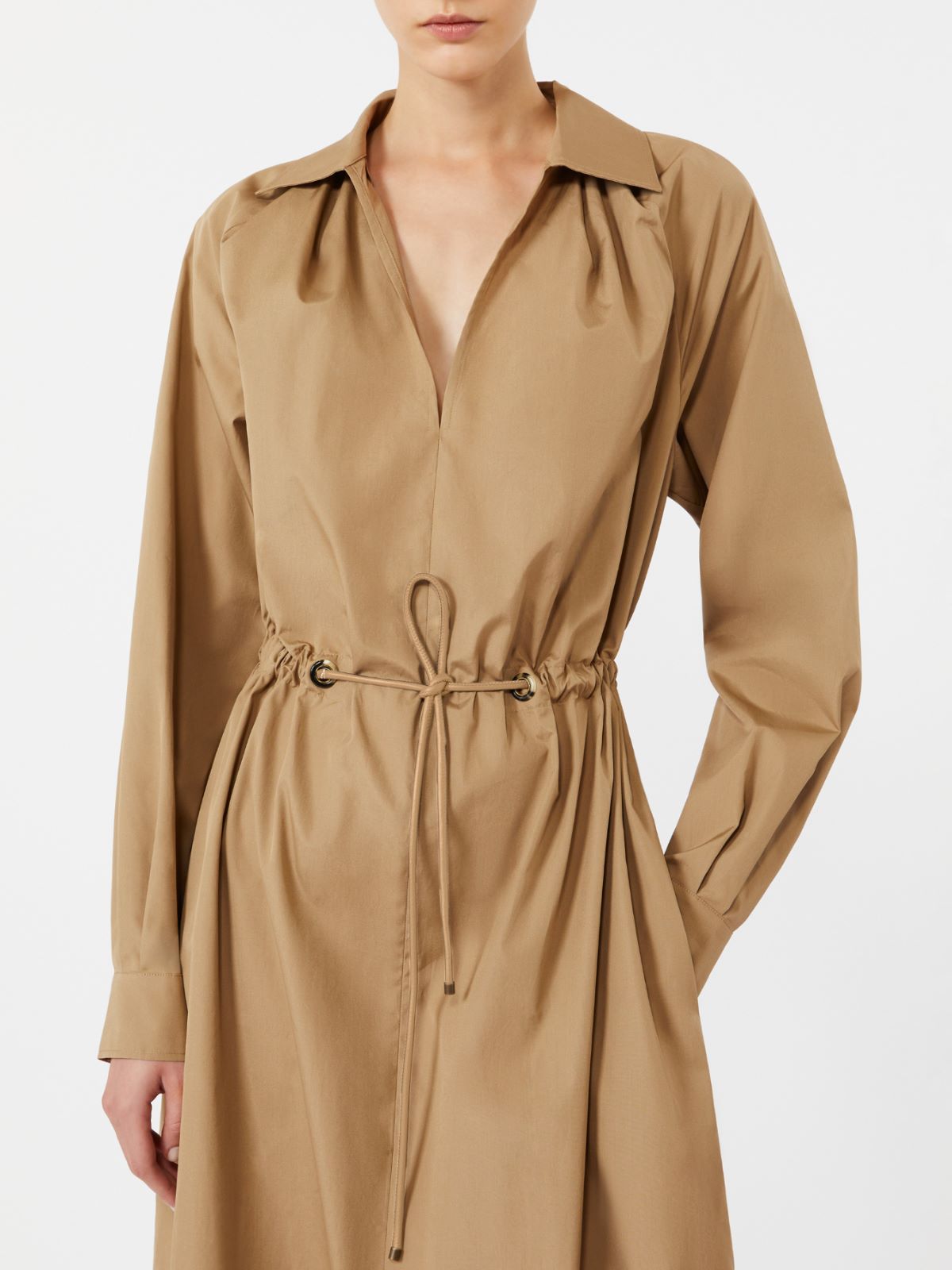가죽 디테일과 메탈 및 뿔 아일렛으로 완성된 허리 드로스트링이 더해진 롱 셔츠 드레스입니다.