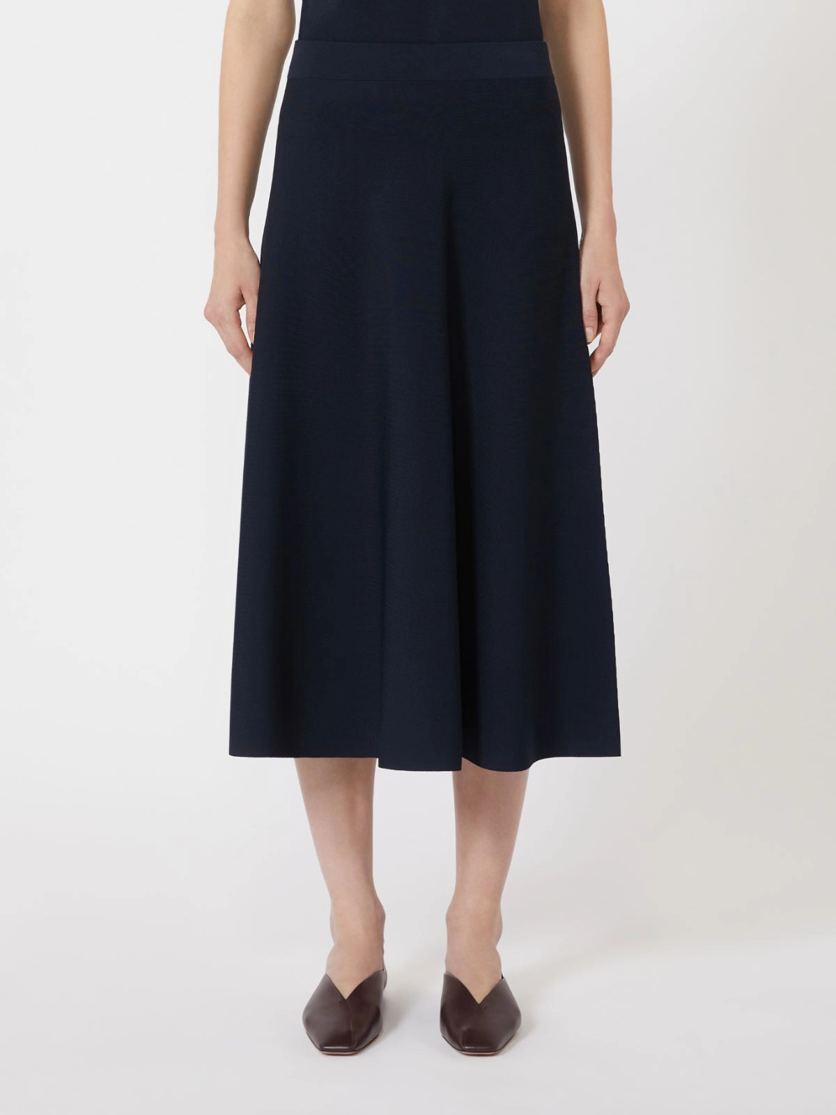비스코스 크레이프 소재의 스커트입니다. 허리 고무 밴딩과 뒷면 중앙 절개선이 더해진 디자인으로, 편안한 핏의 A라인 실루엣이 돋보입니다.