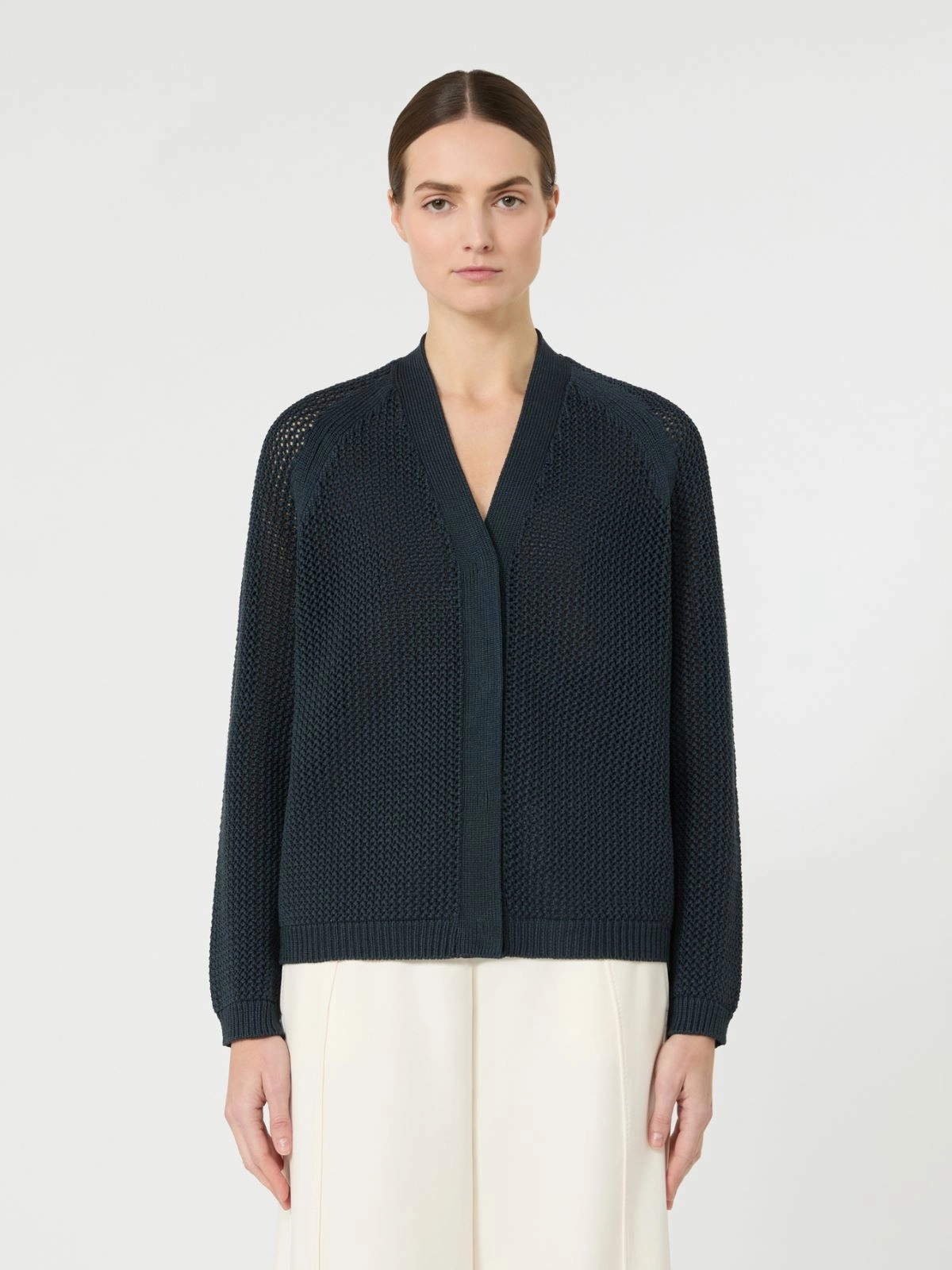 메쉬 짜임과 화인 립조직이 돋보이는 실크와 나일론 코르도넷 소재의 가디건입니다. 브이 넥라인과 래글런 긴소매, 단추 여밈의 스트레이트 핏 디자인입니다. 방충용 삼나무 스틱이 포함된 전용 패키지에 담아 제공되며, 택에는 원단의 기술적 특성이 표기되어 있습니다.