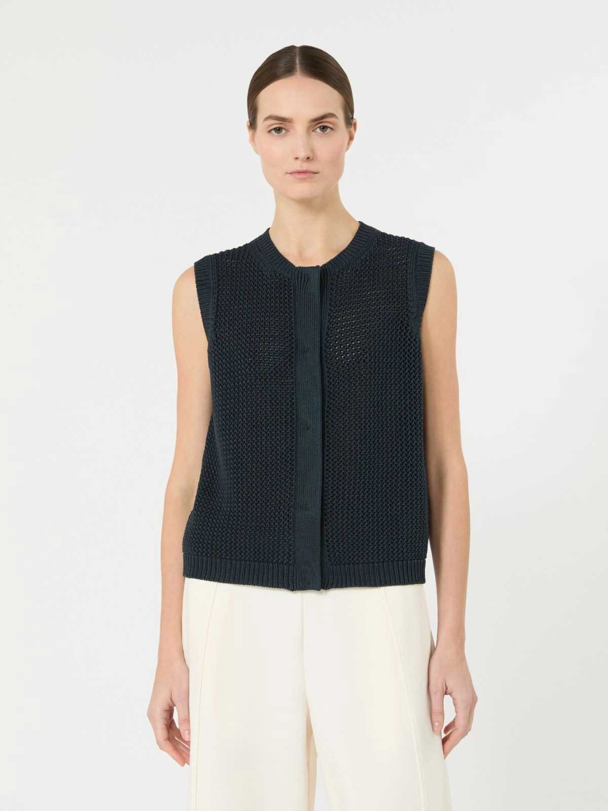 메쉬 짜임과 화인 립조직이 돋보이는 실크와 나일론 코르도넷 소재의 조끼입니다. 크루 넥라인과 단추 여밈의 스트레이트 핏 디자인입니다. 방충용 삼나무 스틱이 포함된 전용 패키지에 담아 제공되며, 택에는 원단의 기술적 특성이 표기되어 있습니다.