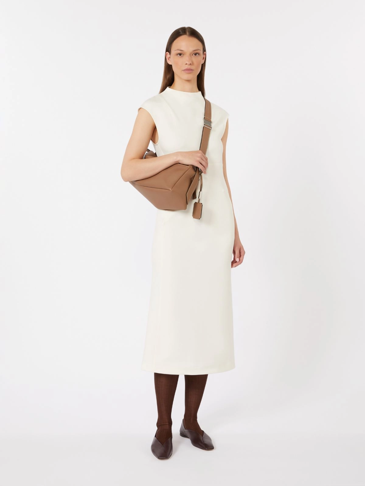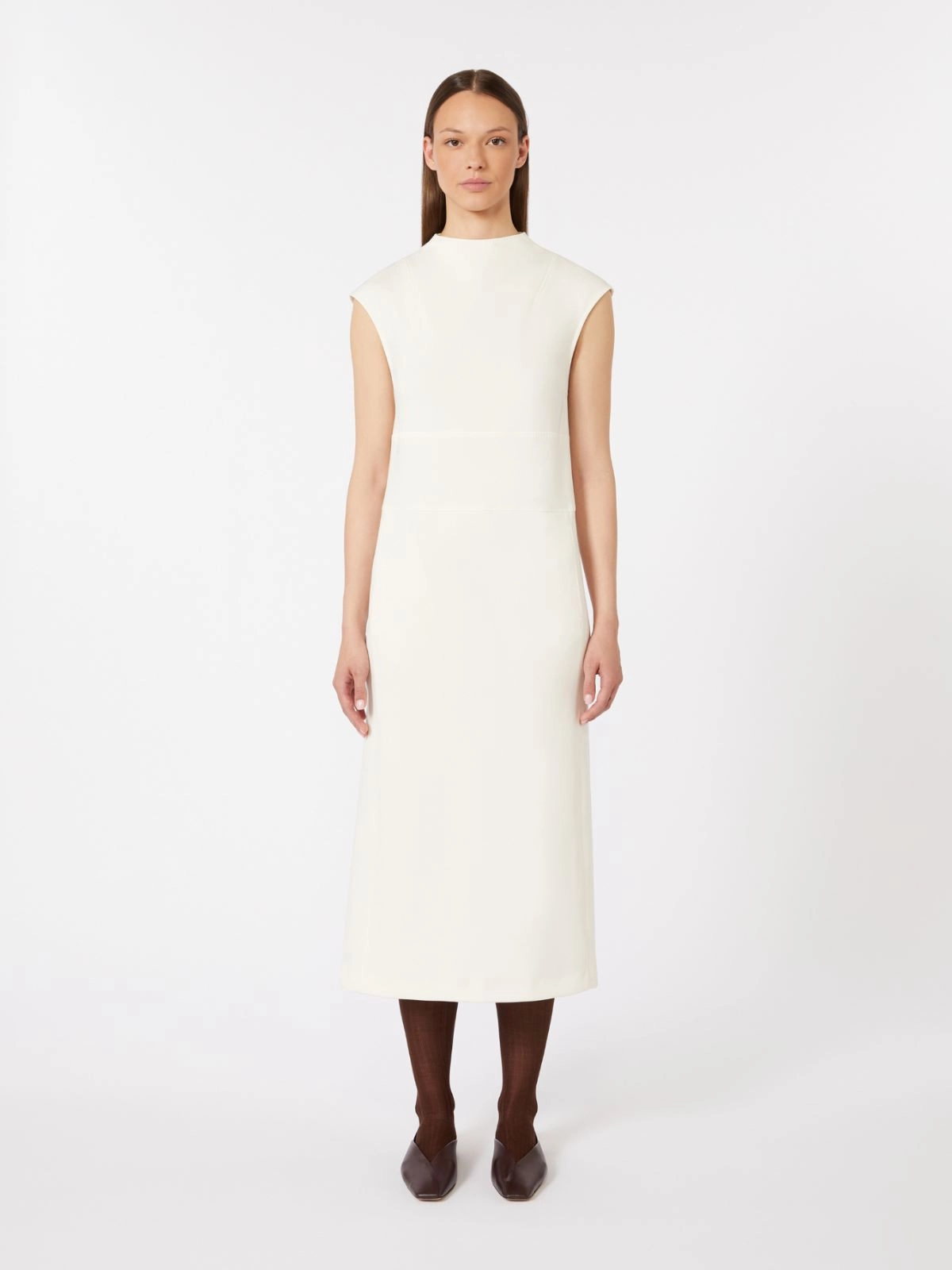 밑단에서 살짝 퍼지는 슬림 시스 실루엣이 특징인 슬리브리스 미디 드레스입니다.