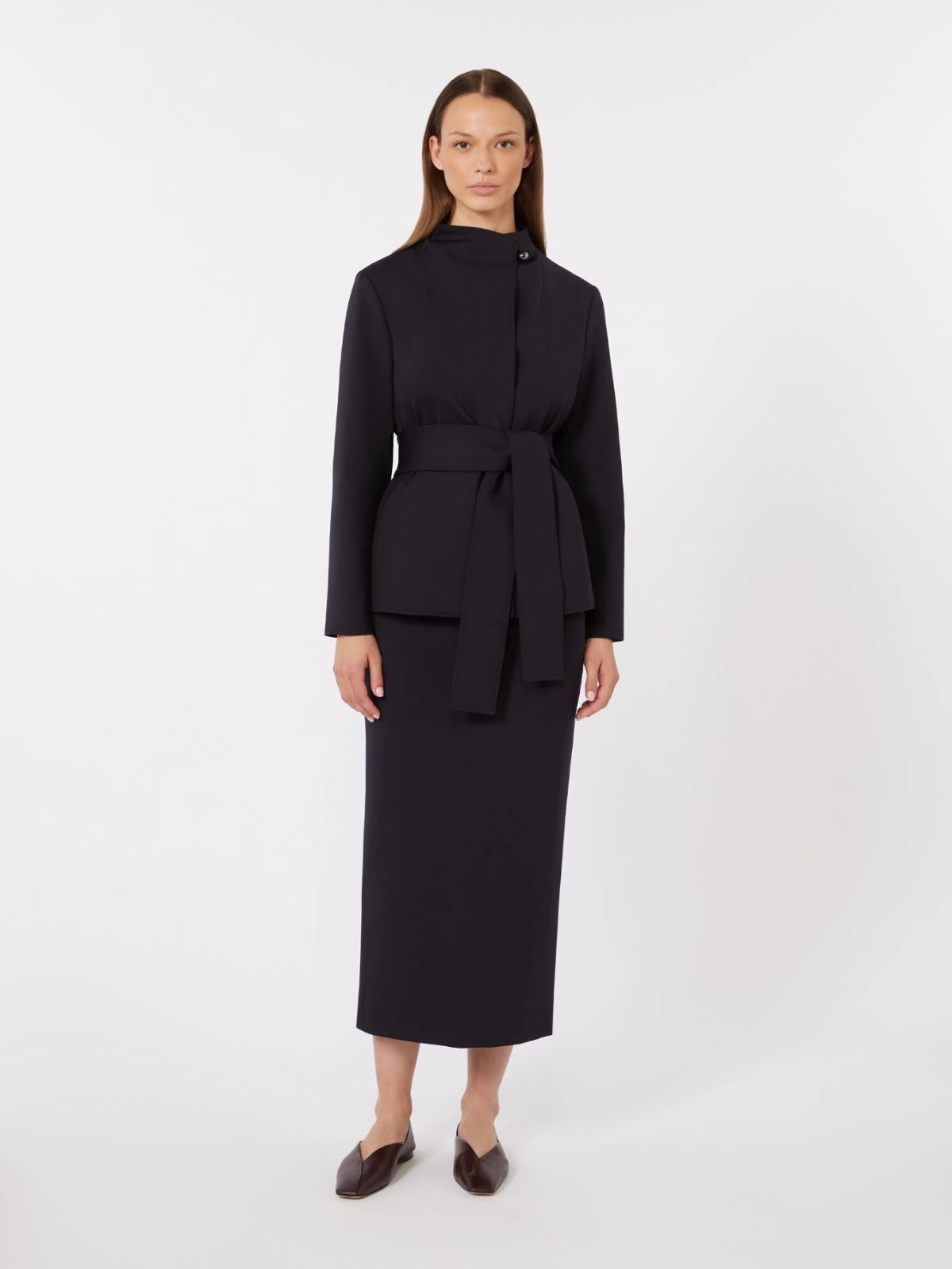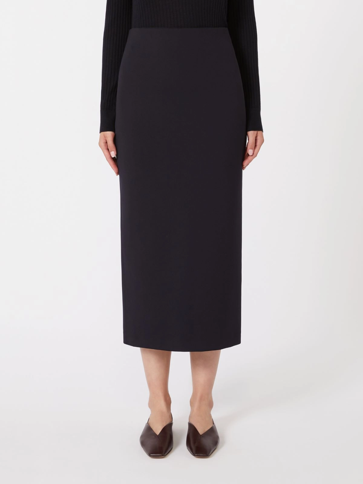 스트레이트 라인의 미디 기장 스커트로, 양 옆면과 허리는 손 바느질한 픽 스티치 장식으로 마감되었습니다.