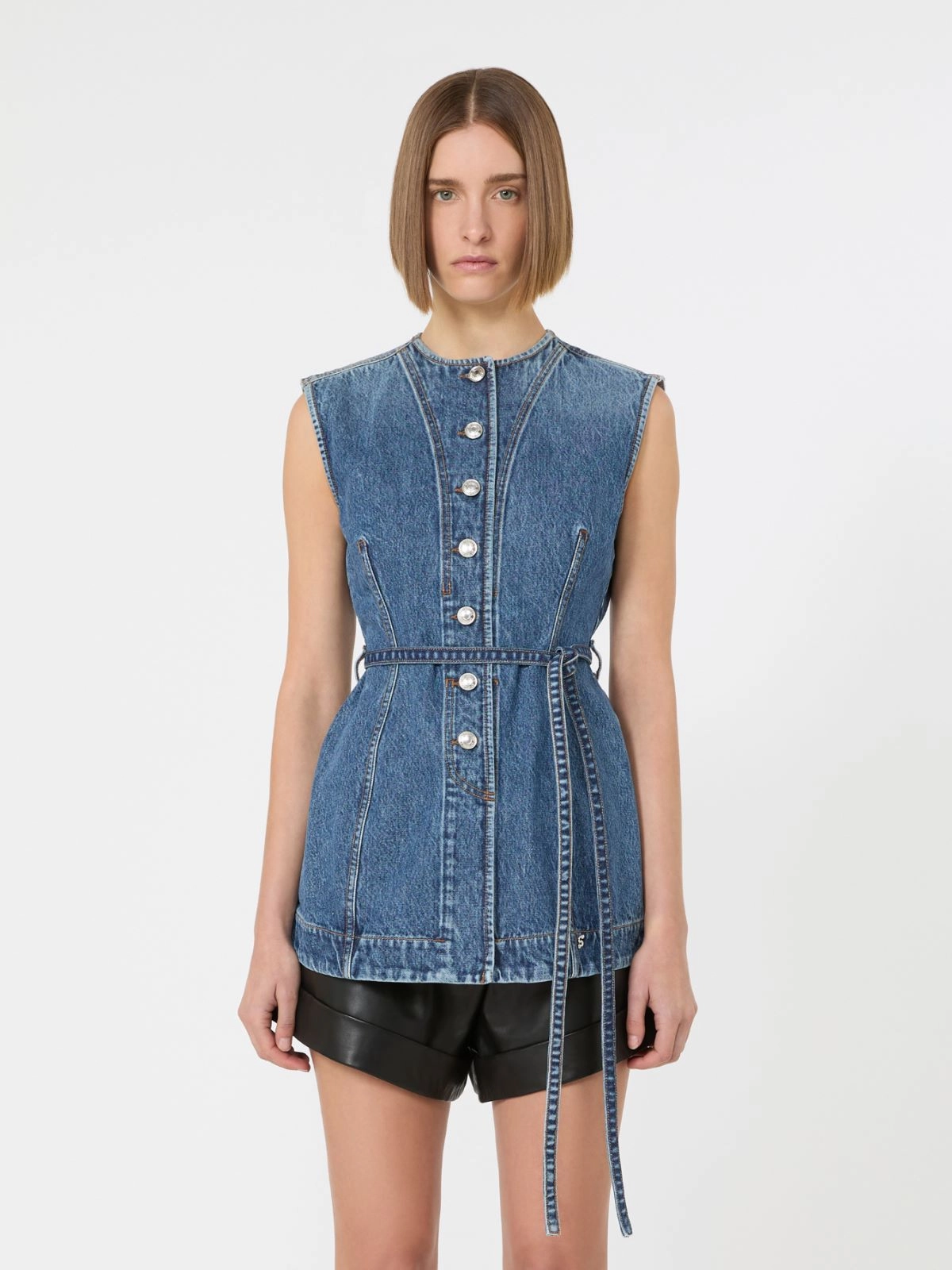본연의 질감을 살린 신축성 없는 인디고 데님 소재의 슬리브리스 탑입니다. 슬림한 실루엣과 허리 매듭 벨트로 바디 라인을 강조했습니다. S자 메탈 리벳이 아이코닉한 포인트를 더해줍니다.