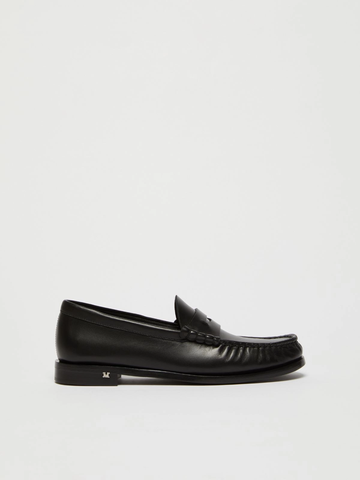 불균일하게 염색되고 세미 글로시 마감 처리된 부드러운 천연 송아지 가죽 페니 로퍼입니다. 갑피 부분은 클래식한 길이의 뱀프가 사용되었으며 안감은 가죽으로 되어 있습니다. 블랙 퍼미스 가죽 밑창으로 힐에는 작은 메탈릭한 M 모노그램 스터드 장식이 있습니다.