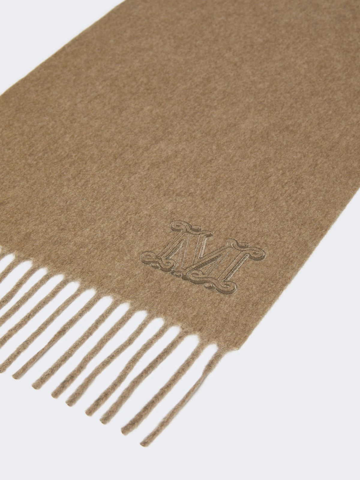 밑단에 우아한 M 모노그램 자수 디테일이 돋보이는 미니멀 디자인의 스카프