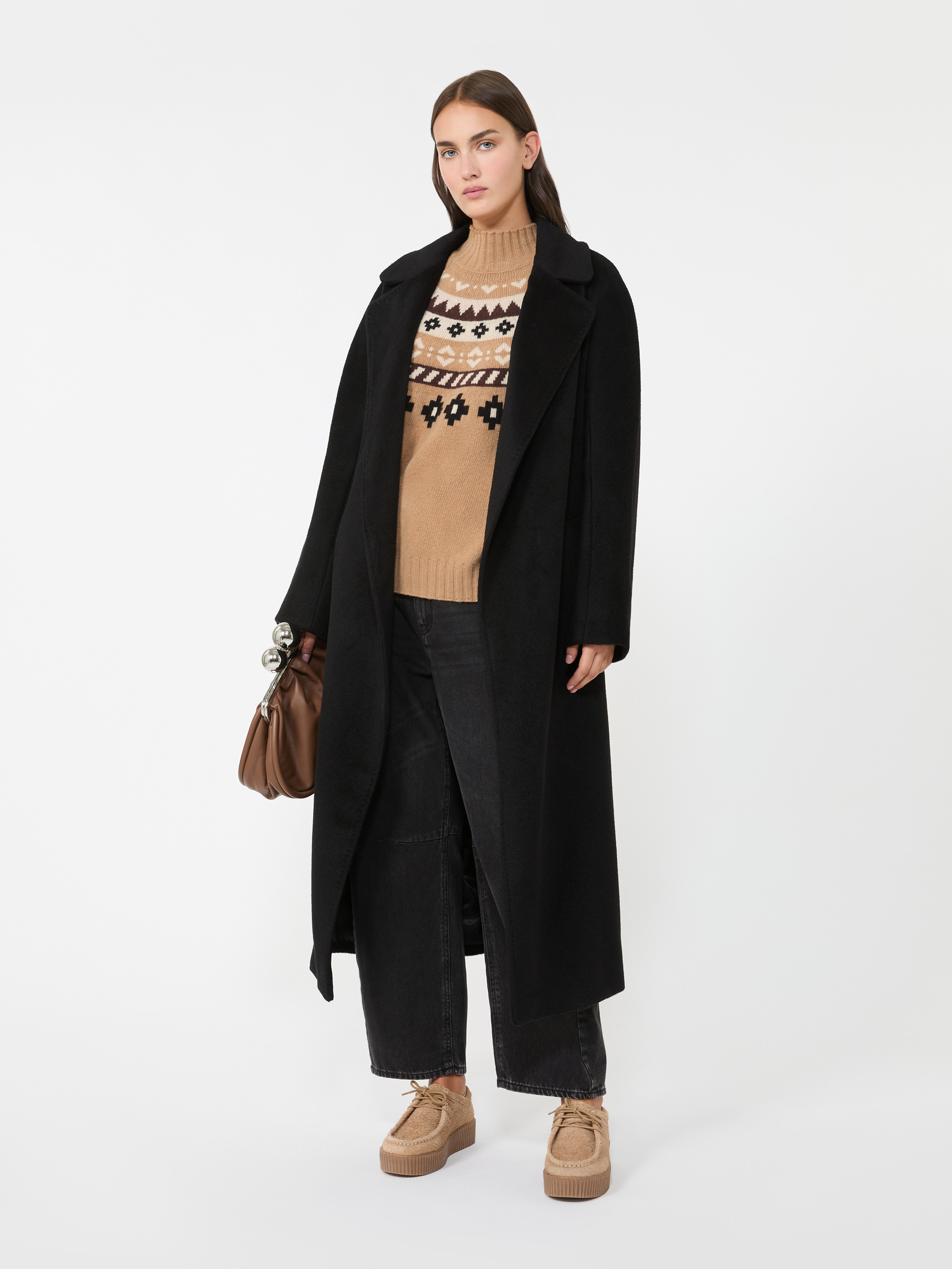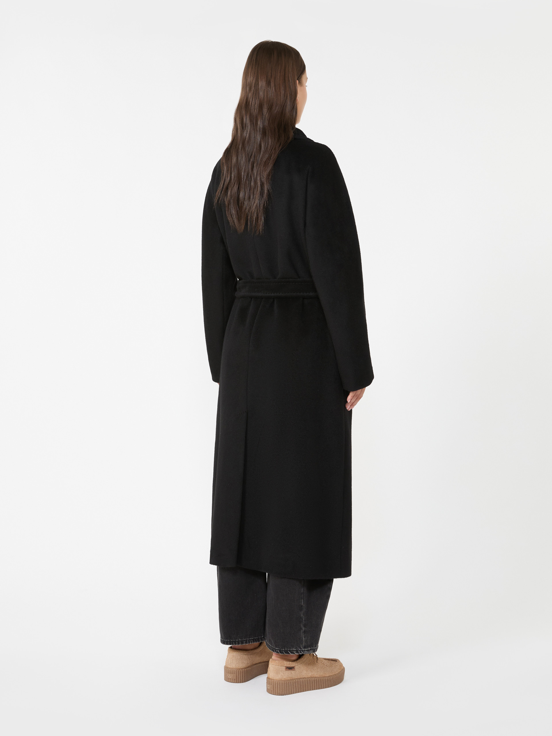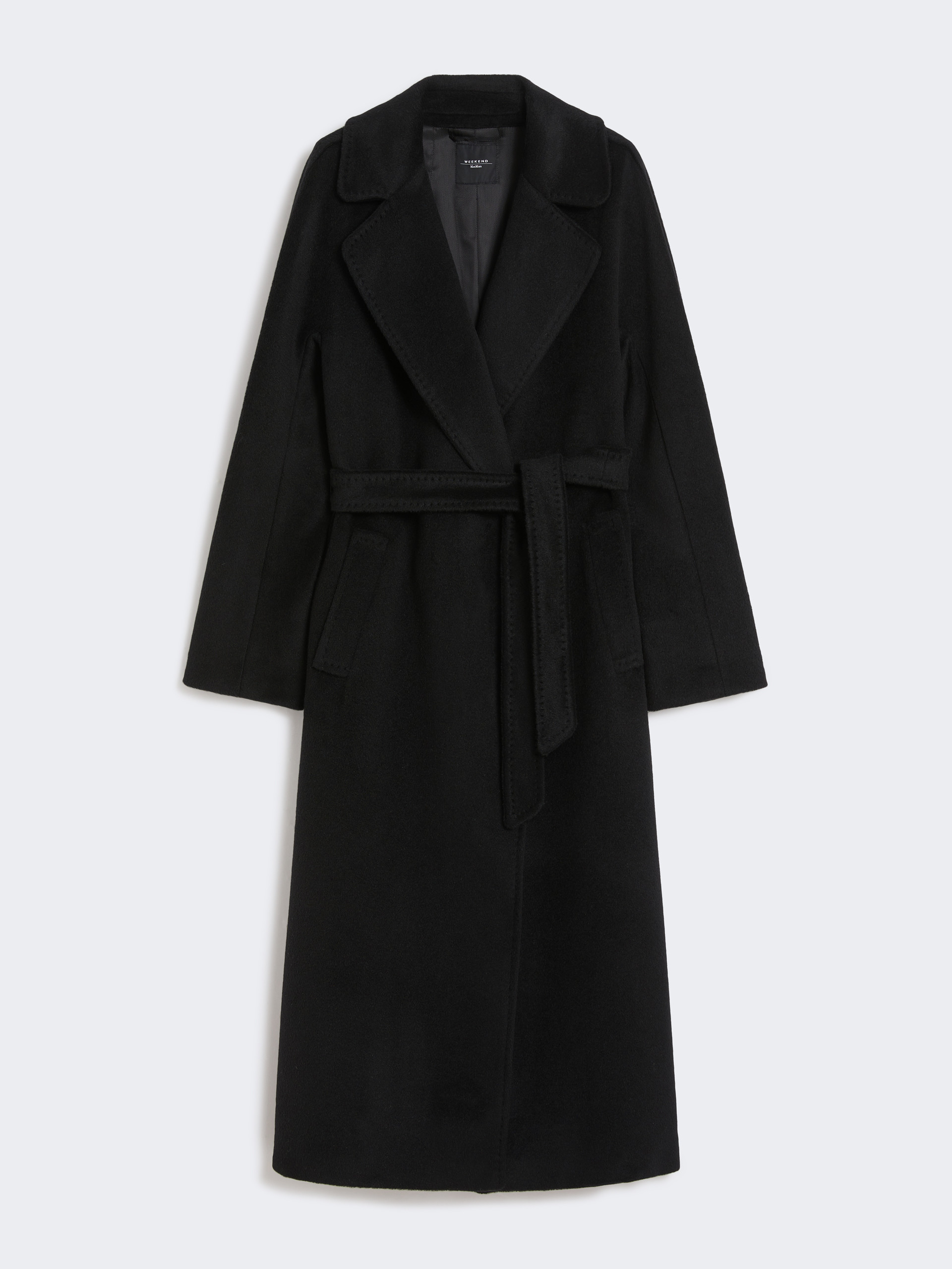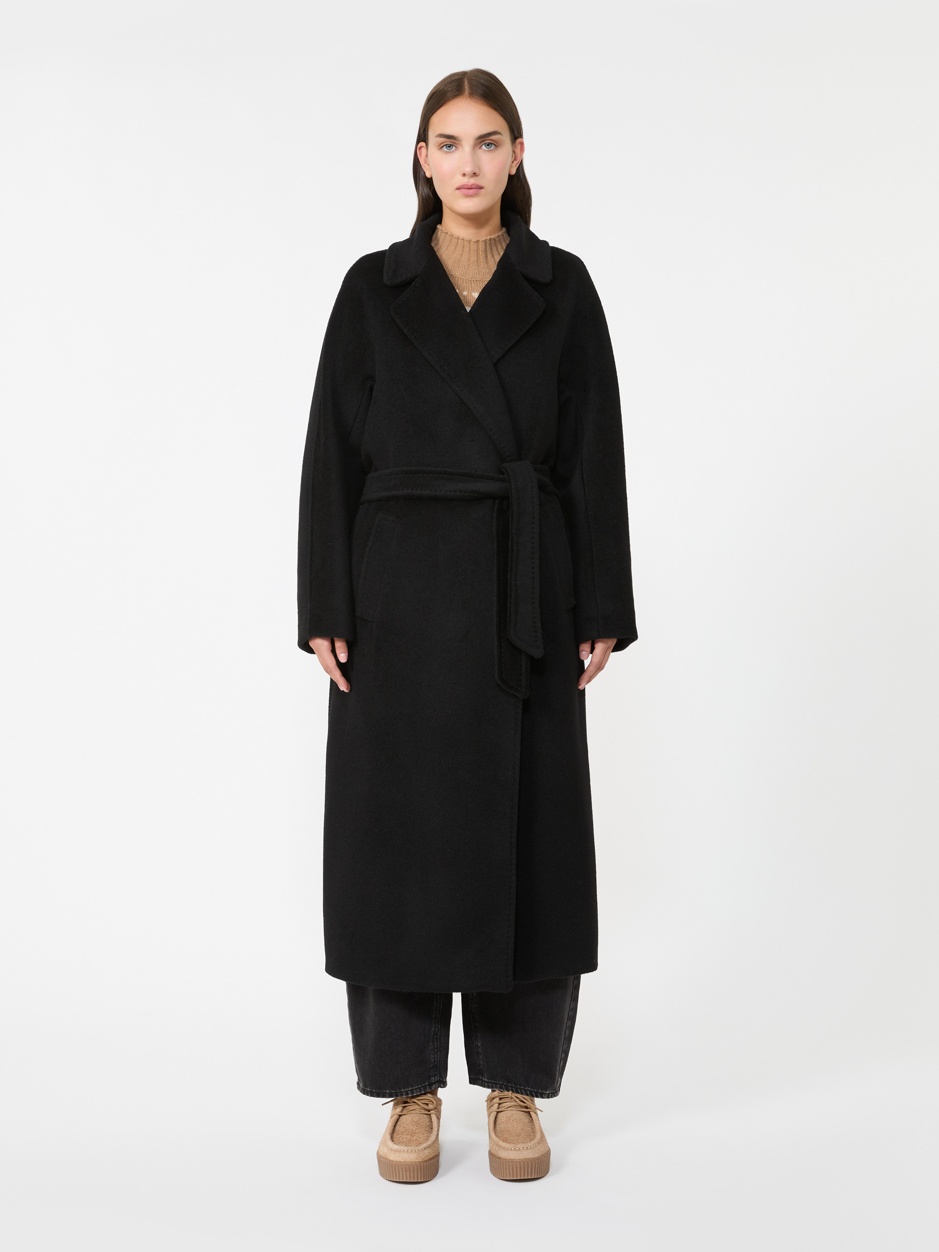 로브 실루엣의 롱 코트로, 동일 소재의 허리 벨트가 함께 제공됩니다.