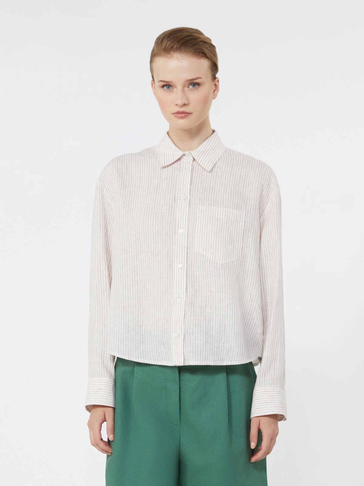 퓨어 린넨 캔버스 원단의 셔츠로, 클래식 카라와 긴소매, 가슴 패치 포켓과 플리츠 주름이 잡힌 뒷면 요크가 특징입니다. 밑단에 자수 로고 디테일이 더해졌으며, 단추 여밈의 박시한 핏입니다.