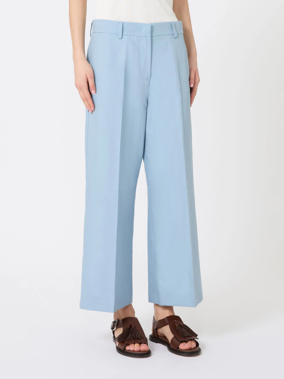 면과 린넨 캔버스 소재의 크롭 트라우저로 허리 벨트고리, 앞면 슬랜트 포켓, 뒷면 단추 여밈 포켓이 더해졌습니다.