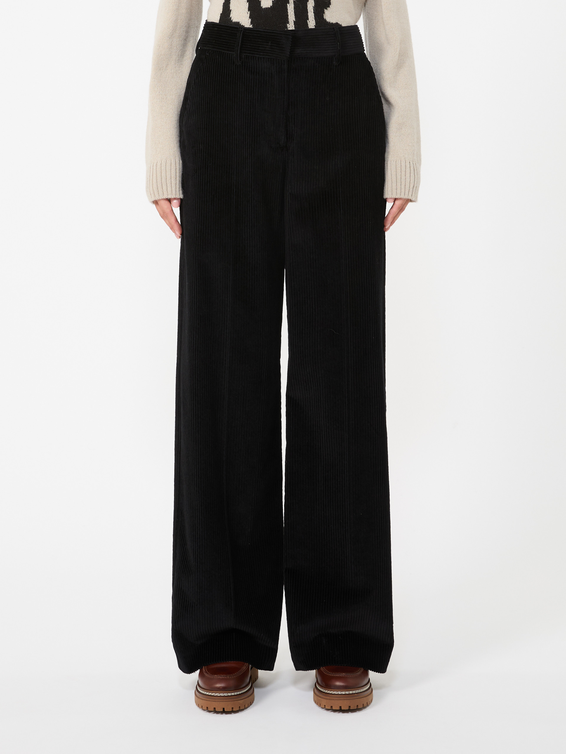 퓨어 면 코듀로이 트라우저로, 벨트 고리가 있는 웨이스트 밴드, 앞면 슬랜트 포켓, 단추 여밈 뒷면 웰트 포켓이 있습니다. 편안한 핏의 트라우저로 지퍼와 후크 앤 바 여밈방식입니다.