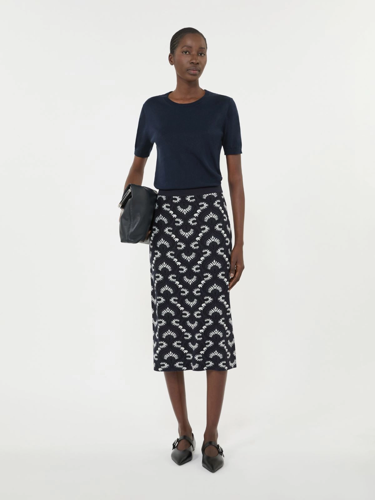 전체에 자카드 니트를 적용한 미디 기장의 펜슬 스커트입니다.
