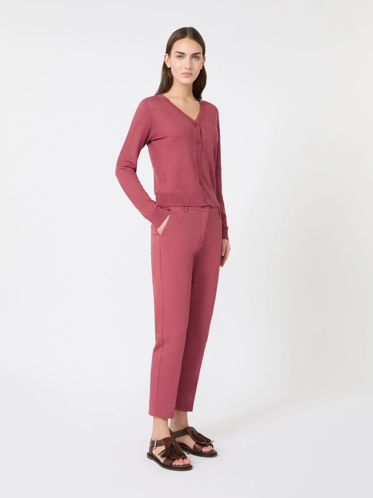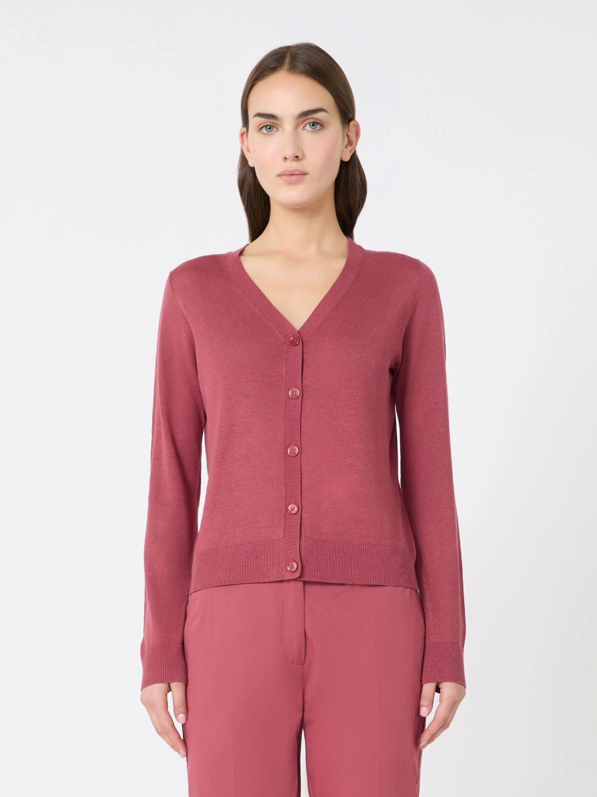 화인 립조직 마감이 돋보이는 실크와 린넨 소재의 가디건입니다. 브이 넥라인과 어깨선이 낮은 셋인 긴소매가 더해졌으며, 마더오브펄 단추 여밈의 레귤러 핏 디자인입니다.