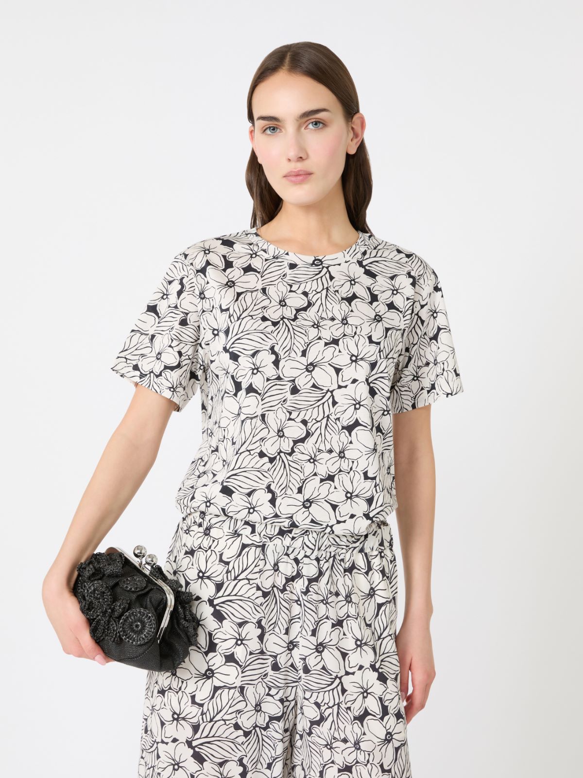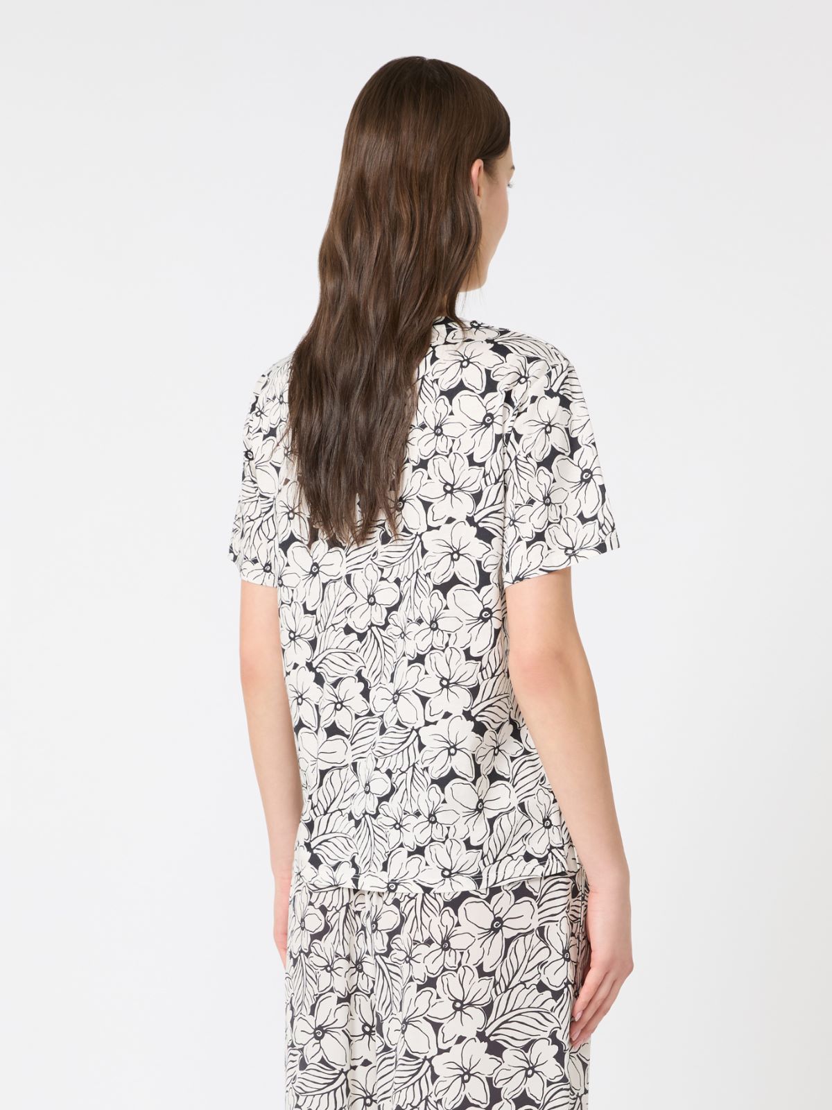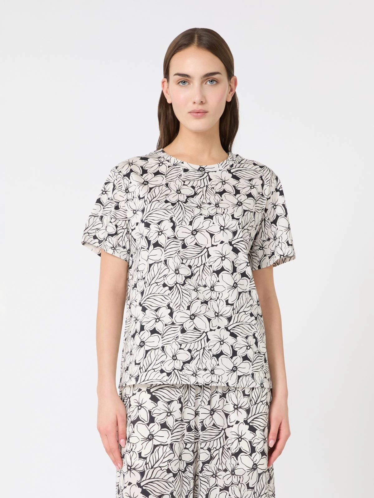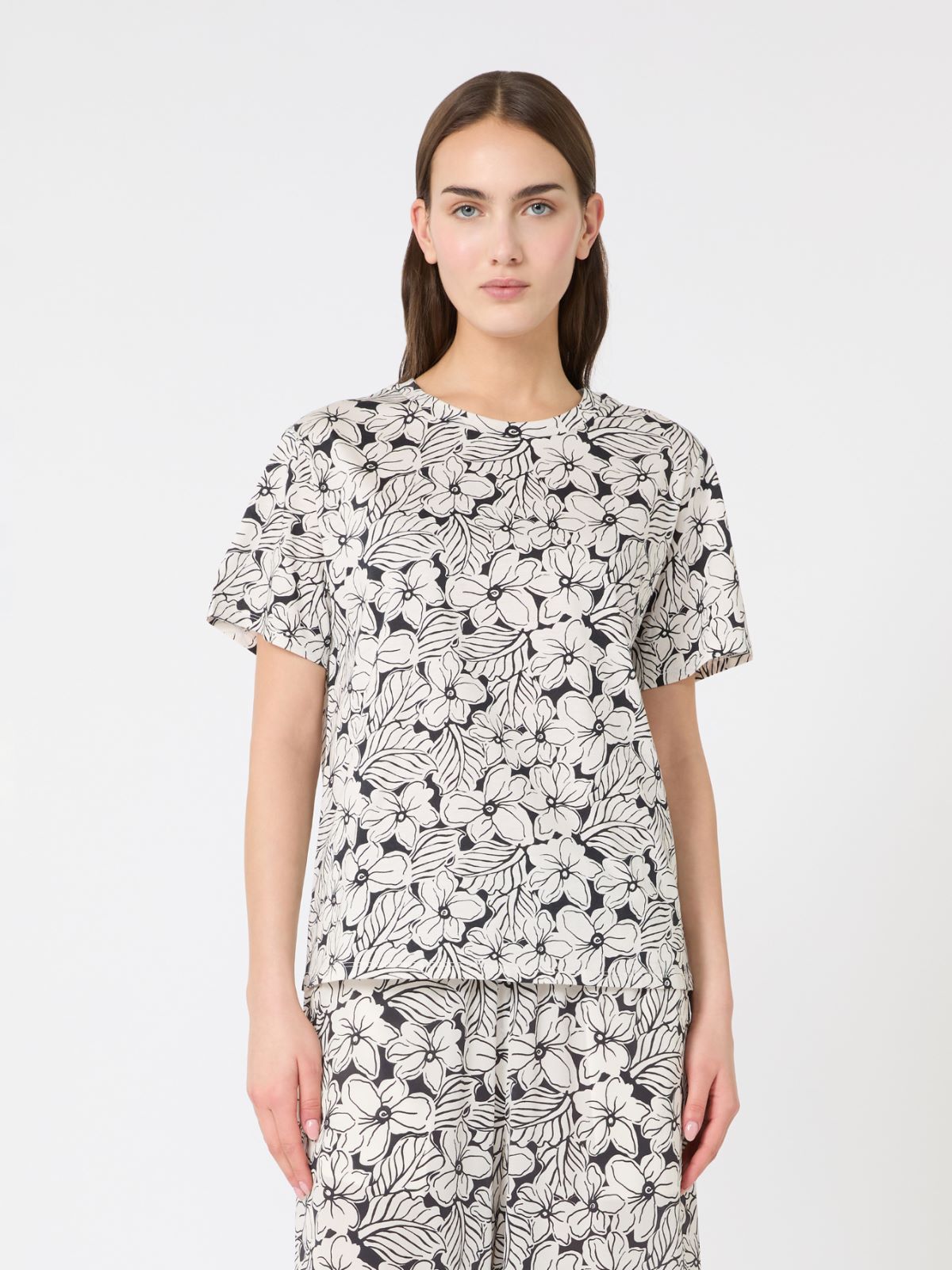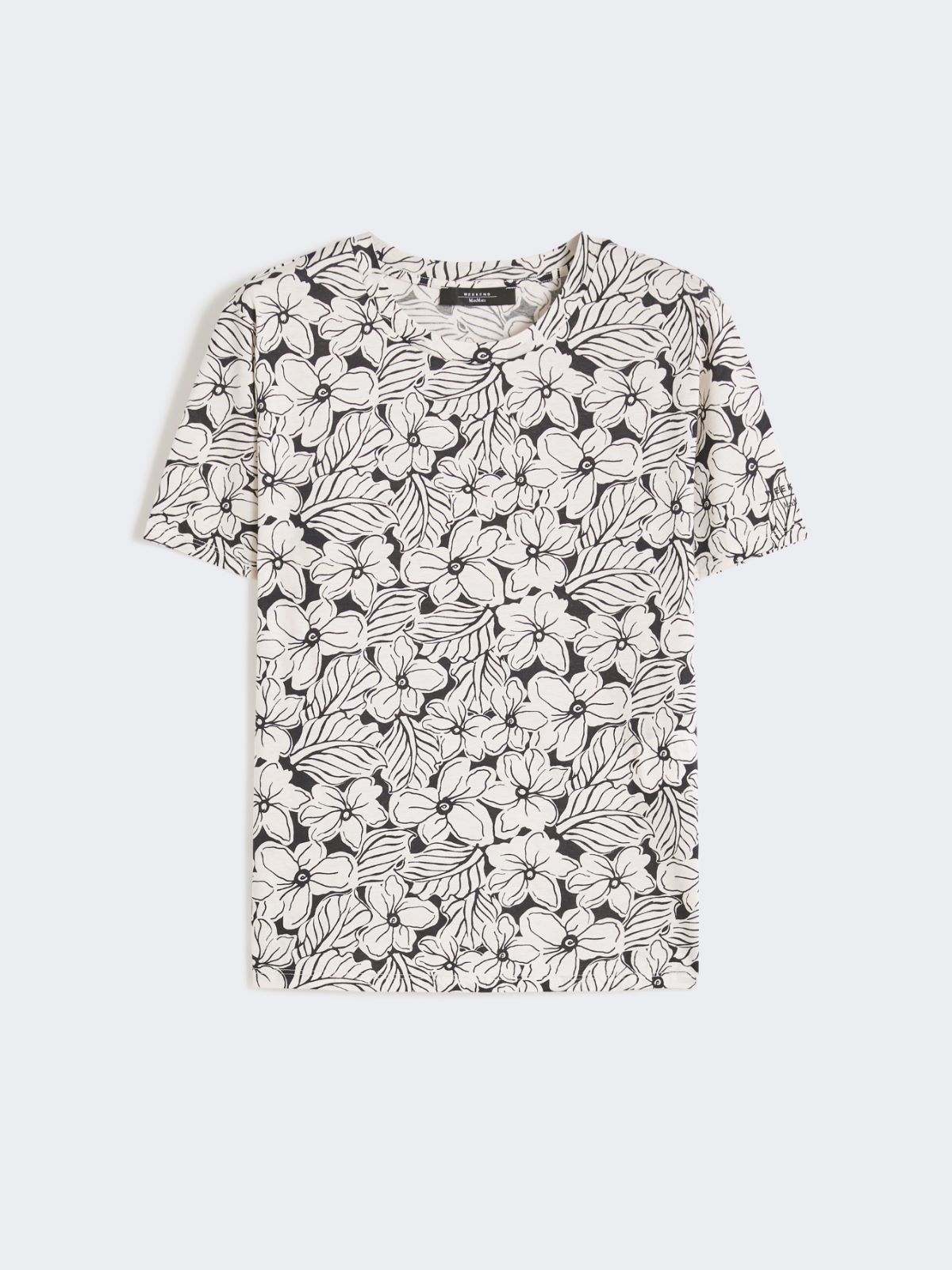 퓨어 면 저지 소재의 반소매 크루넥 티셔츠입니다. 전체에 프린트를 더했으며, 한쪽 소매에는 자수 로고를 적용한 스트레이트 핏 디자인입니다.