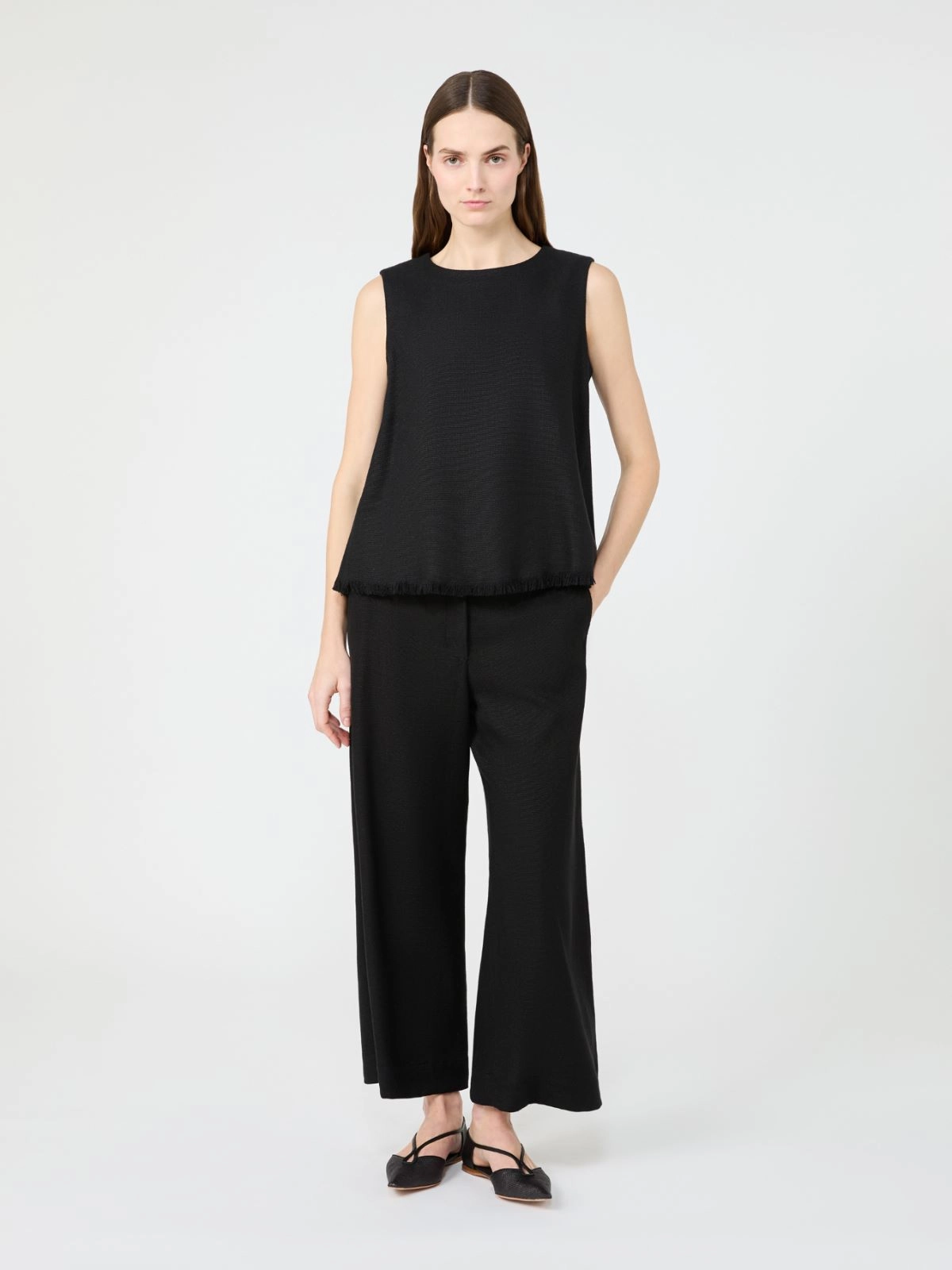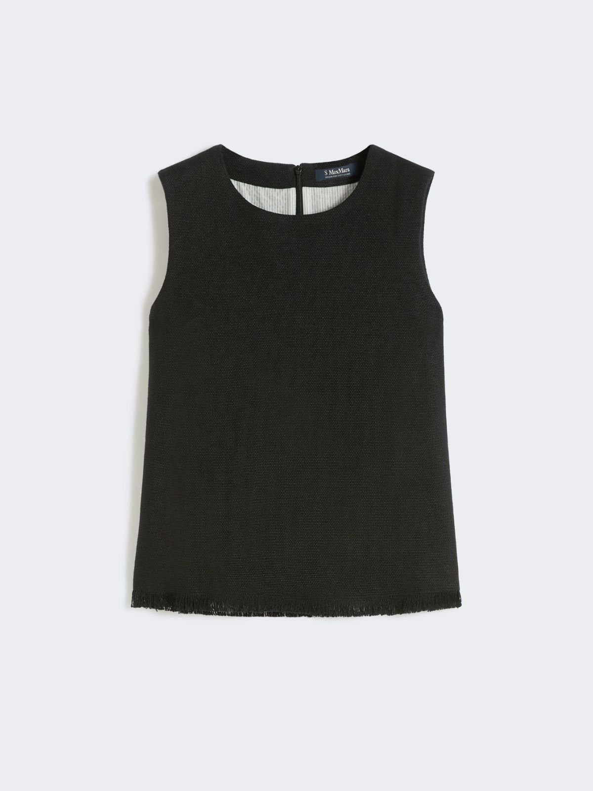 밑단에 작은 프린지 디테일이 더해진 슬리브리스 탑입니다.