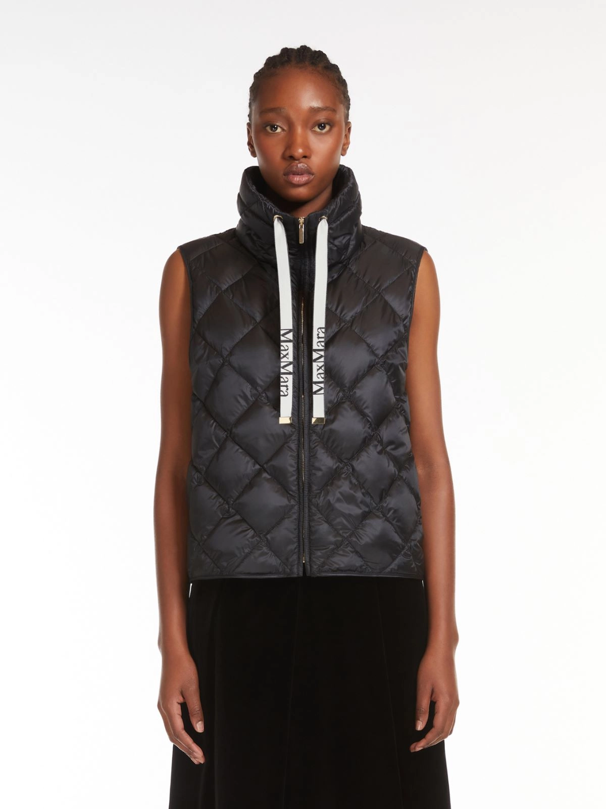 오버사이즈 자카드 로고 리본 드로스트링이 있는 하이 넥 디자인 다이아몬드 퀼팅 조끼입니다