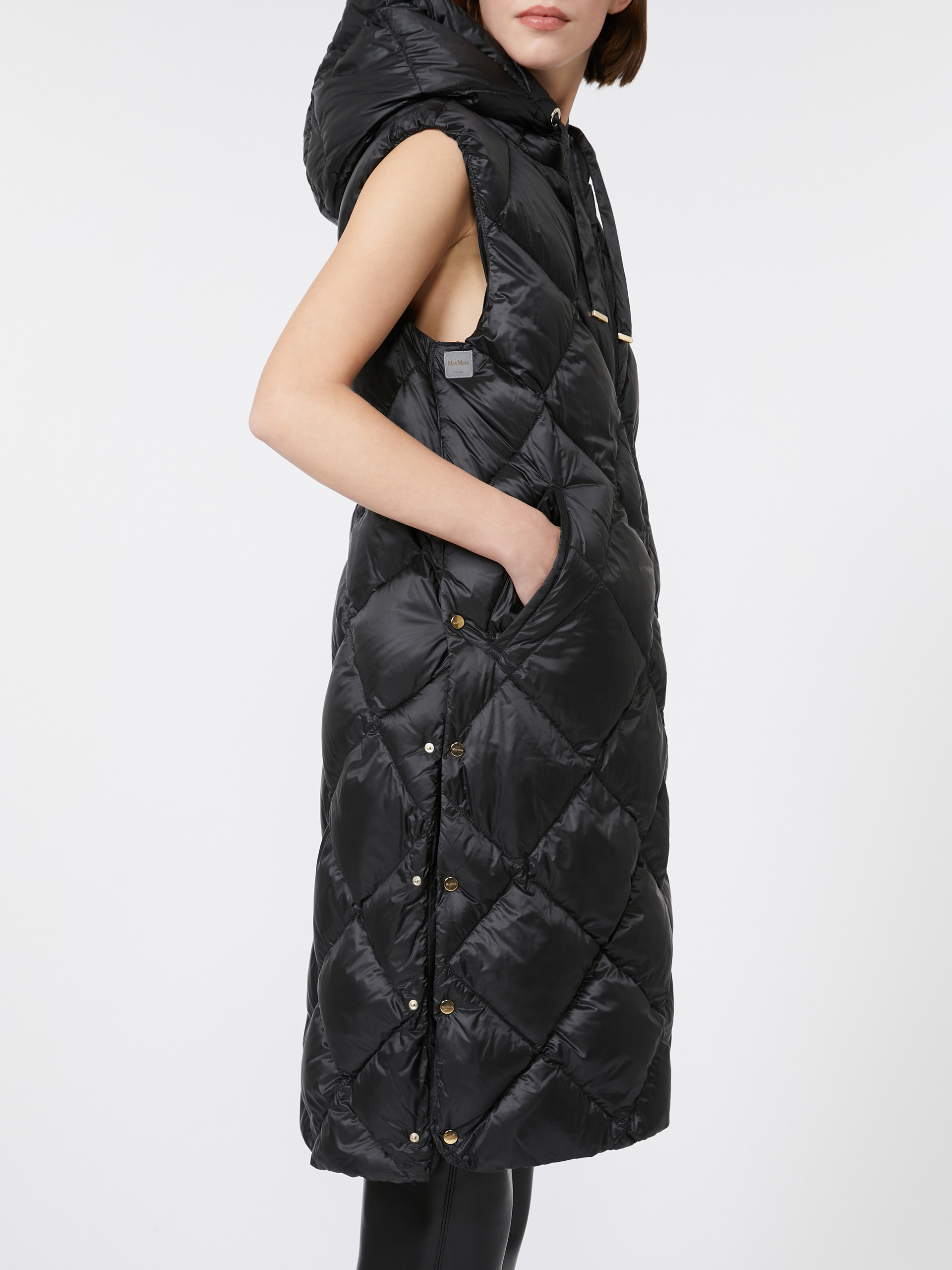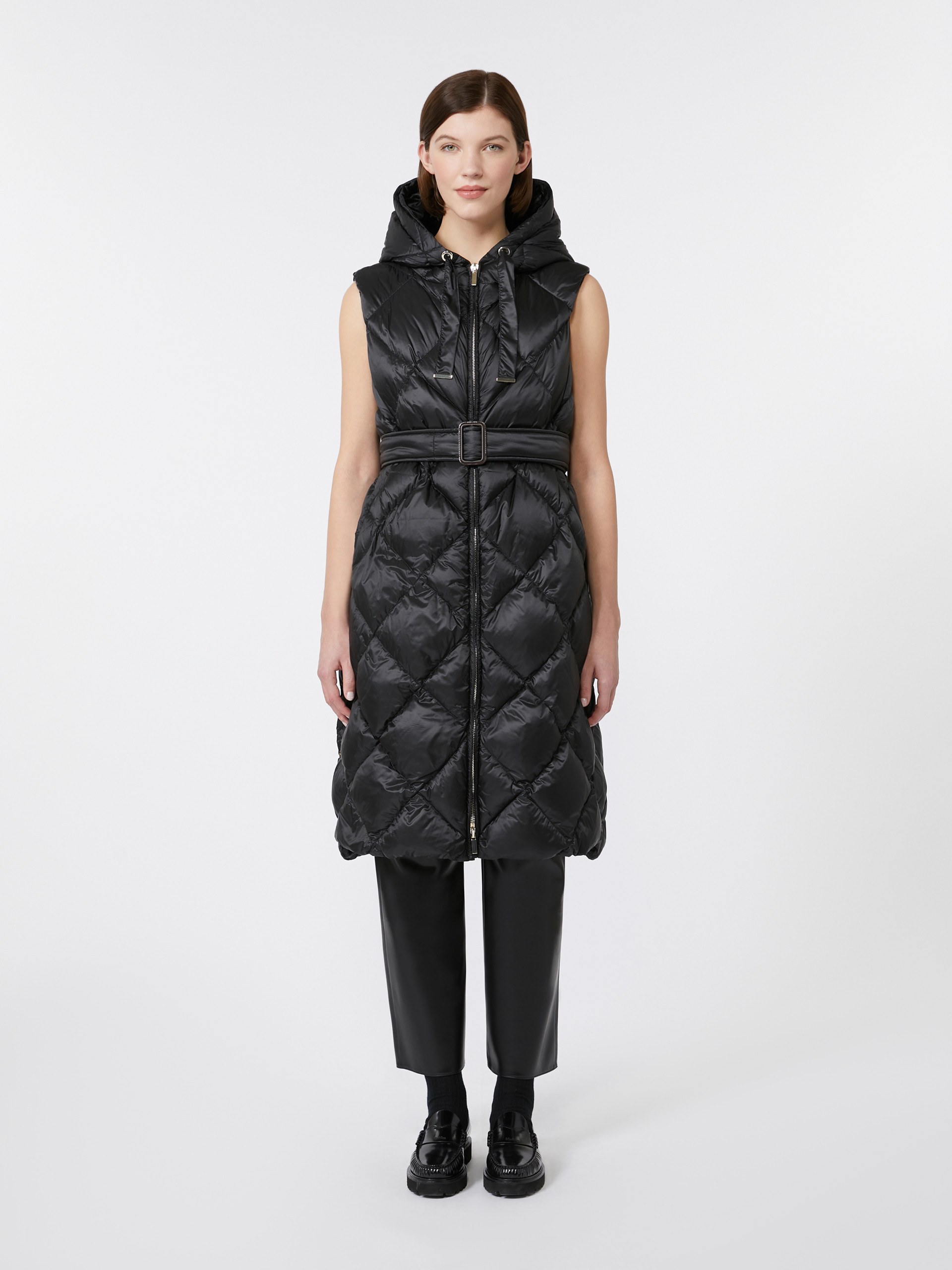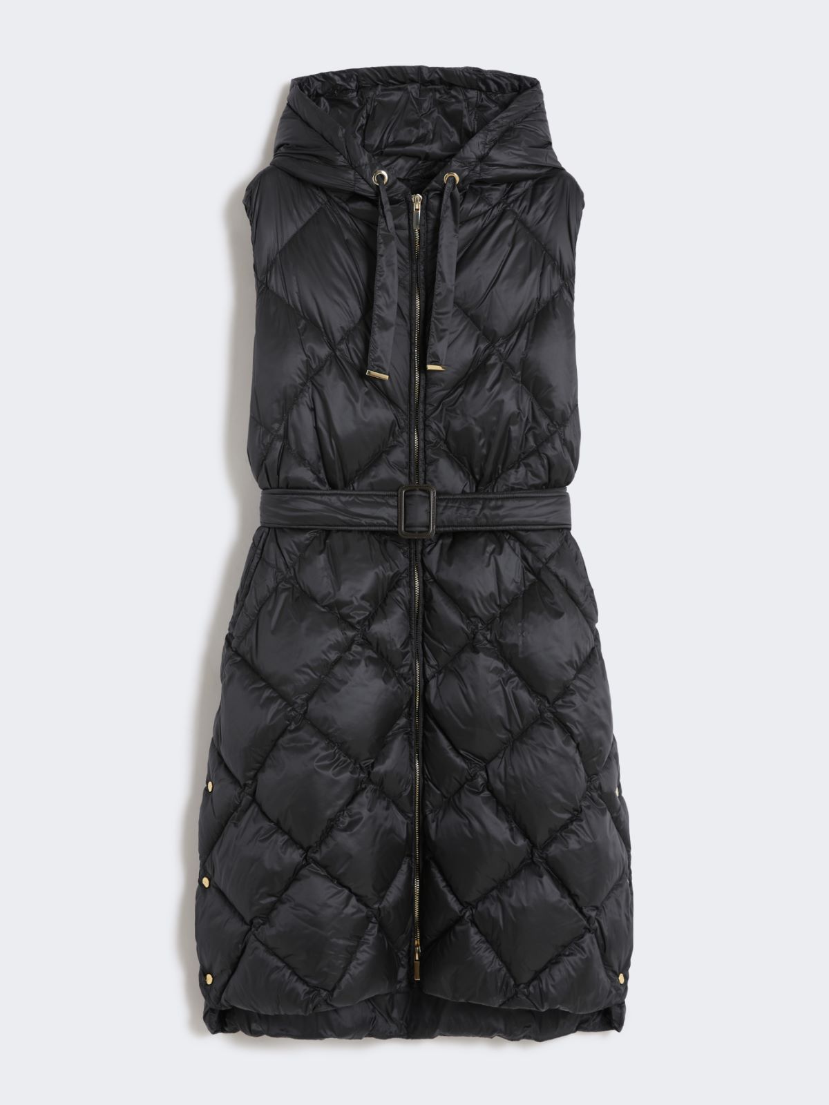 발수 나일론 캔버스 소재의 미디 길이 퀼팅 패딩 조끼입니다. 드로스트링 후드가 달린 카라, 웰트 포켓, 프레스 스터드 여밈의 슬릿, 뒷면 하프 벨트가 있습니다. 지퍼 여밈이며 벨트가 제공됩니다. Max Mara The Cube 컬렉션 액세서리(별도 판매)로 나만의 스타일을 연출할 수 있습니다.