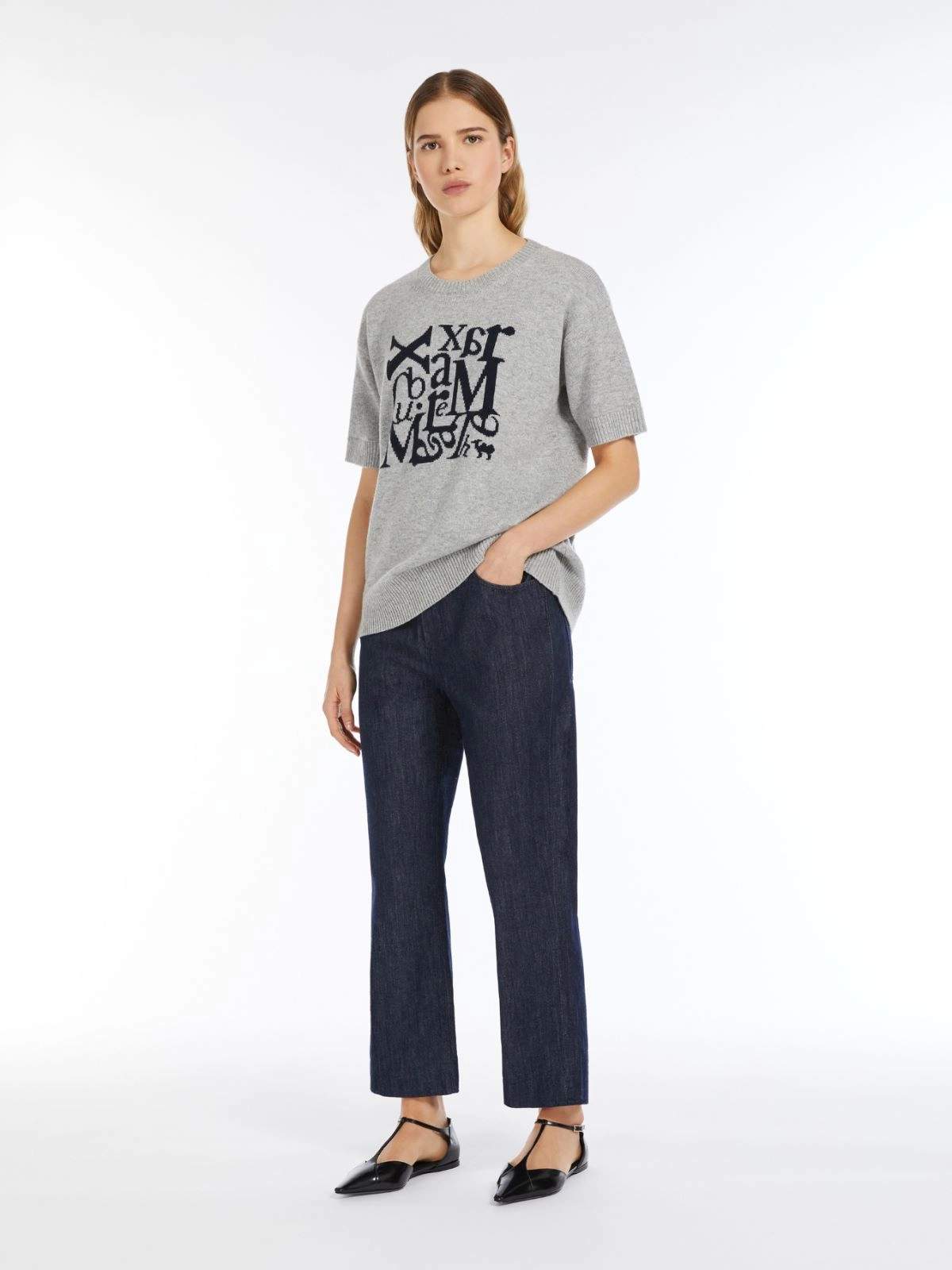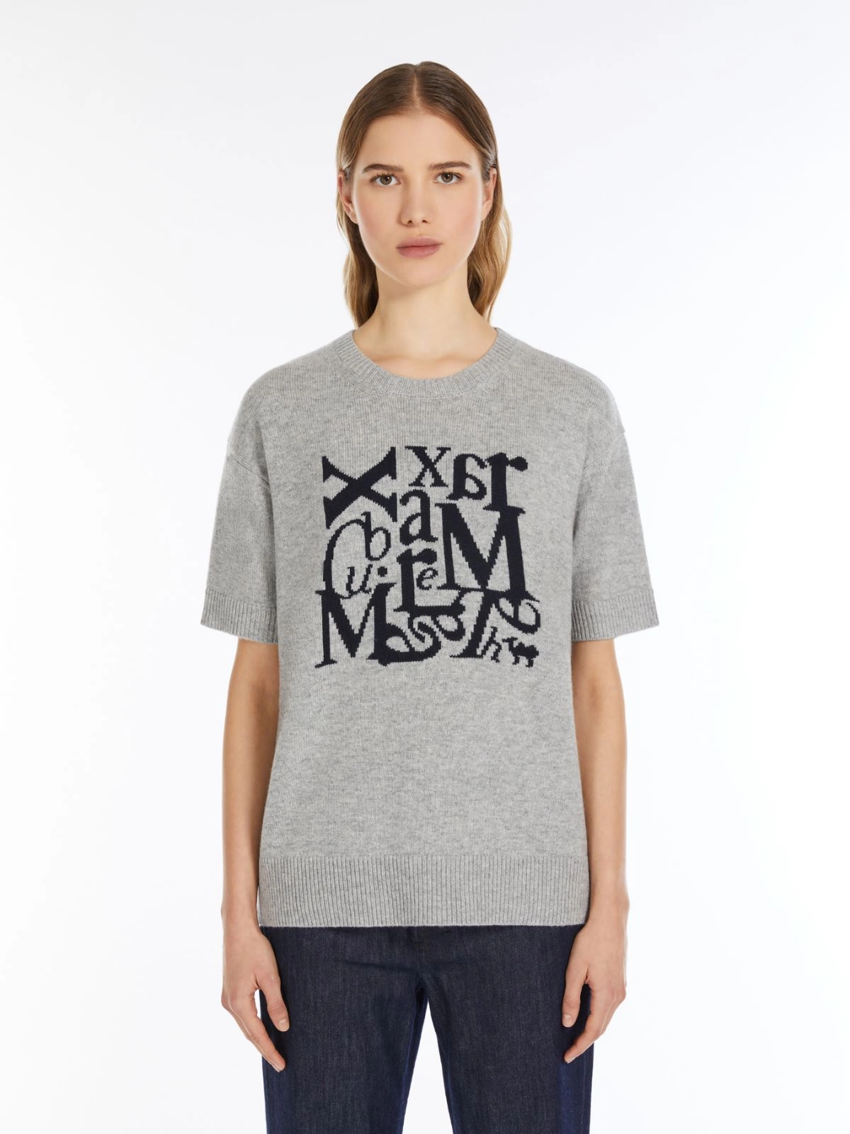 고급 울 및 캐시미어 혼방 크루넥 스웨터로 앞면에는 대비를 이루는 Max Mara The Cube 인타르시아 모티브가 있습니다. 드롭 숄더 디자인의 반소매로 가장자리는 립조직으로 마무리되어 있습니다.