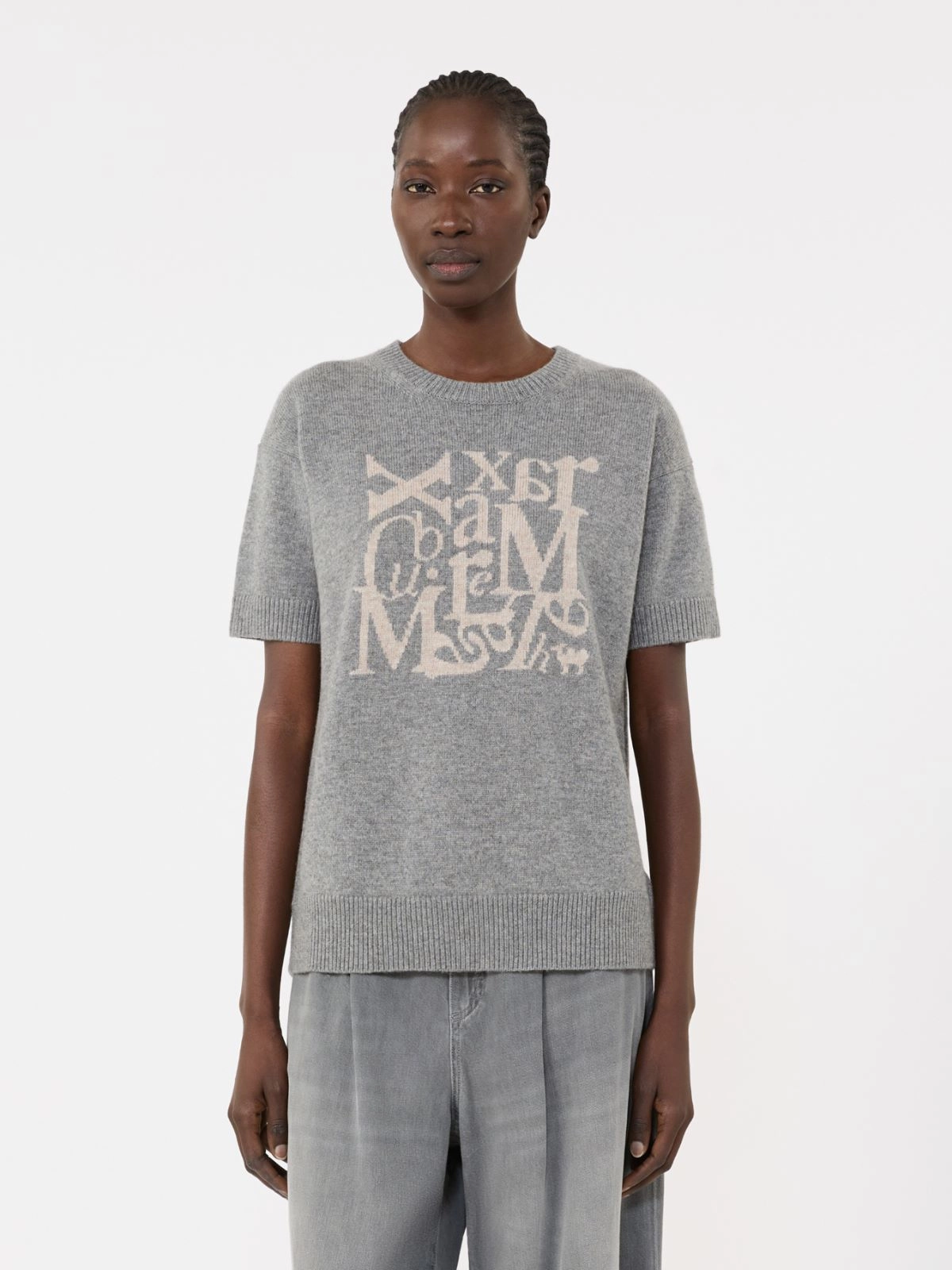 앞면의 인타르시아 모티브가 돋보이는 반소매 스웨터입니다.