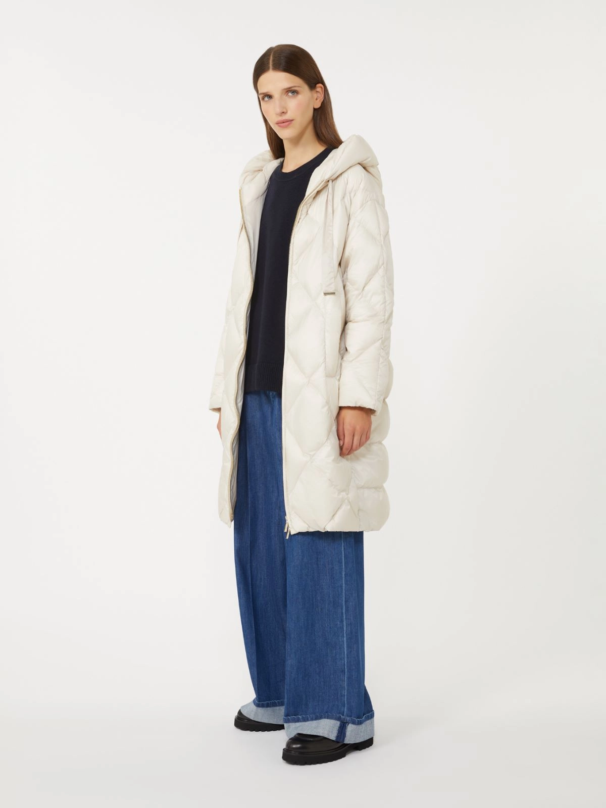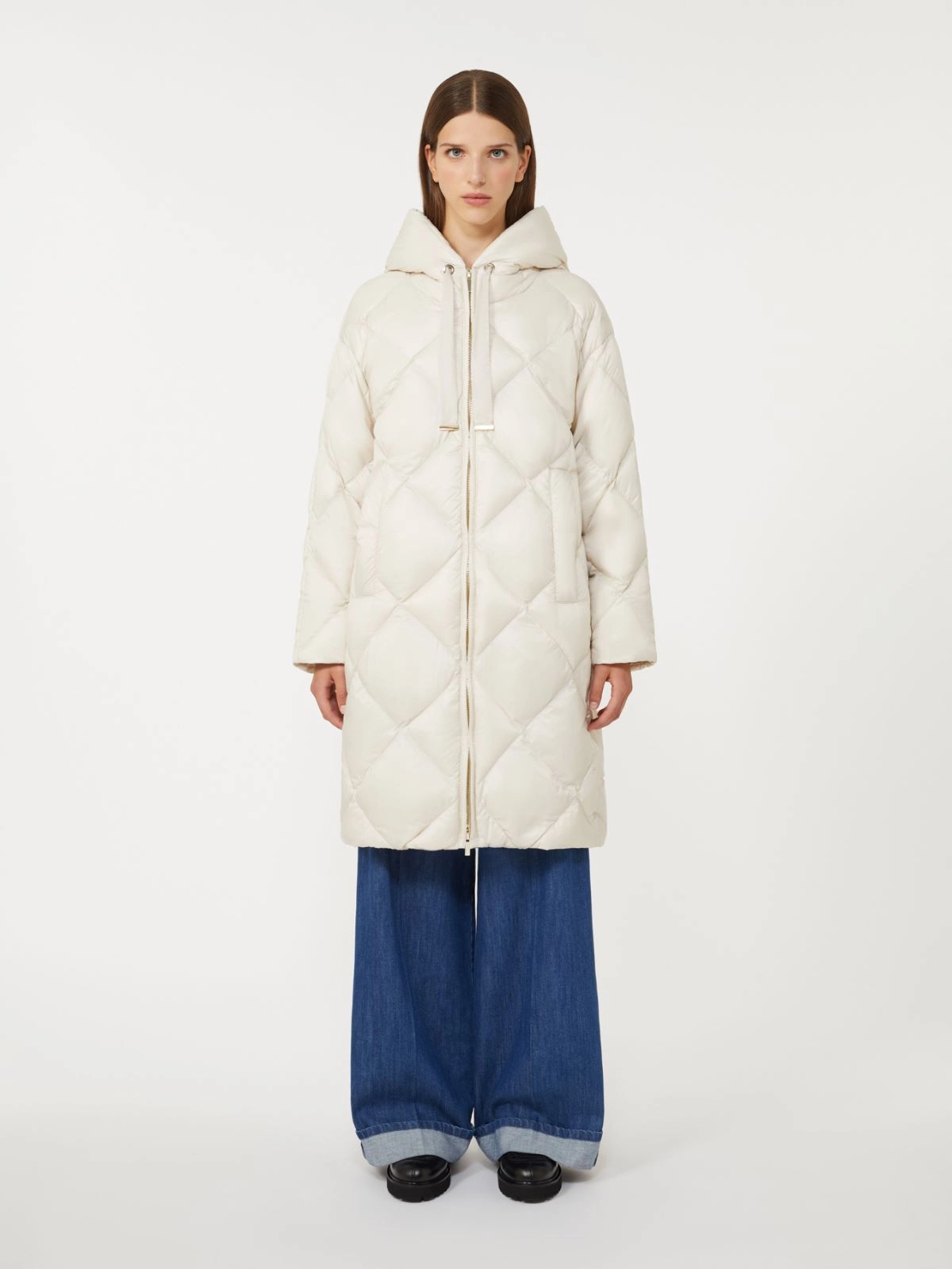 은은한 컬러 광택이 감도는 발수 나일론 캔버스 소재의 롱 퀼팅 패딩 재킷입니다. 드로스트링 후드가 달린 카라, 긴소매, 웰트 포켓이 있습니다. 지퍼 여밈이며 스트레이트 핏입니다.